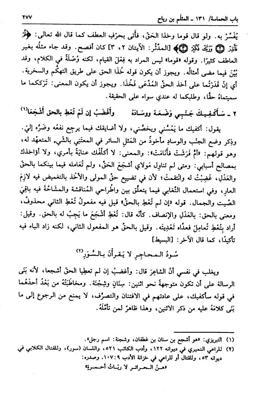 ويغلب في نفسي أن الشاعر قال وأغضب إن لم تعطيا الحق أشجعا، لأنه بني الرسالة على أن تكون متوجهةً نحو اثنين: سنانٍ وشجنة. ومخاطبته من بعد أحدهما في قوله سأكفيك، على عادتهم في الافتنان والتصرف، لا يمنع من الرجوع إلى ما بني كلامه عليه من ذكر الاثنين. وهذا ظاهرٌ لمن تأمله.