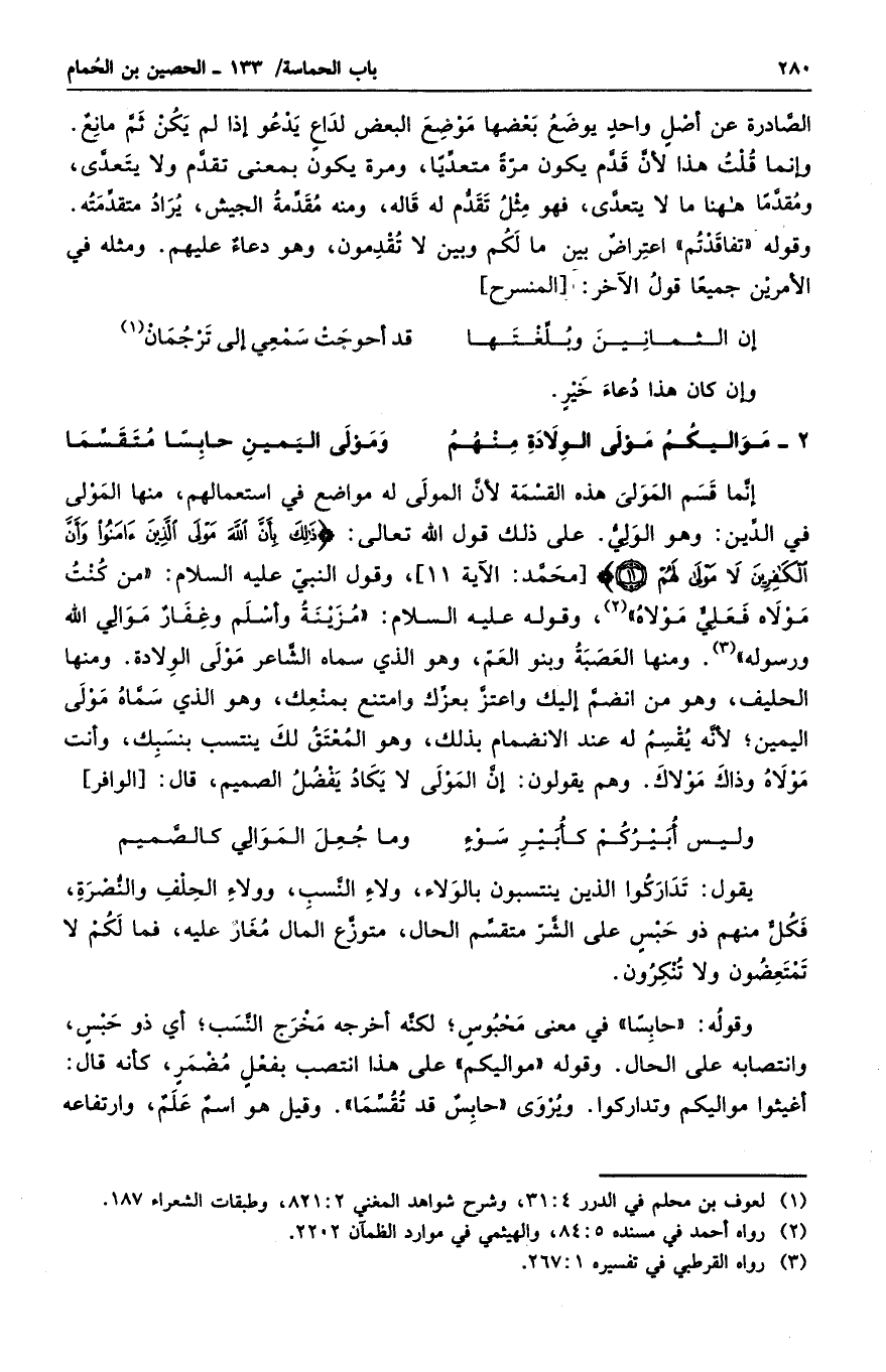 مواليكم مولى الولادة منهم ... ومولى اليمين حابساً متقسماً