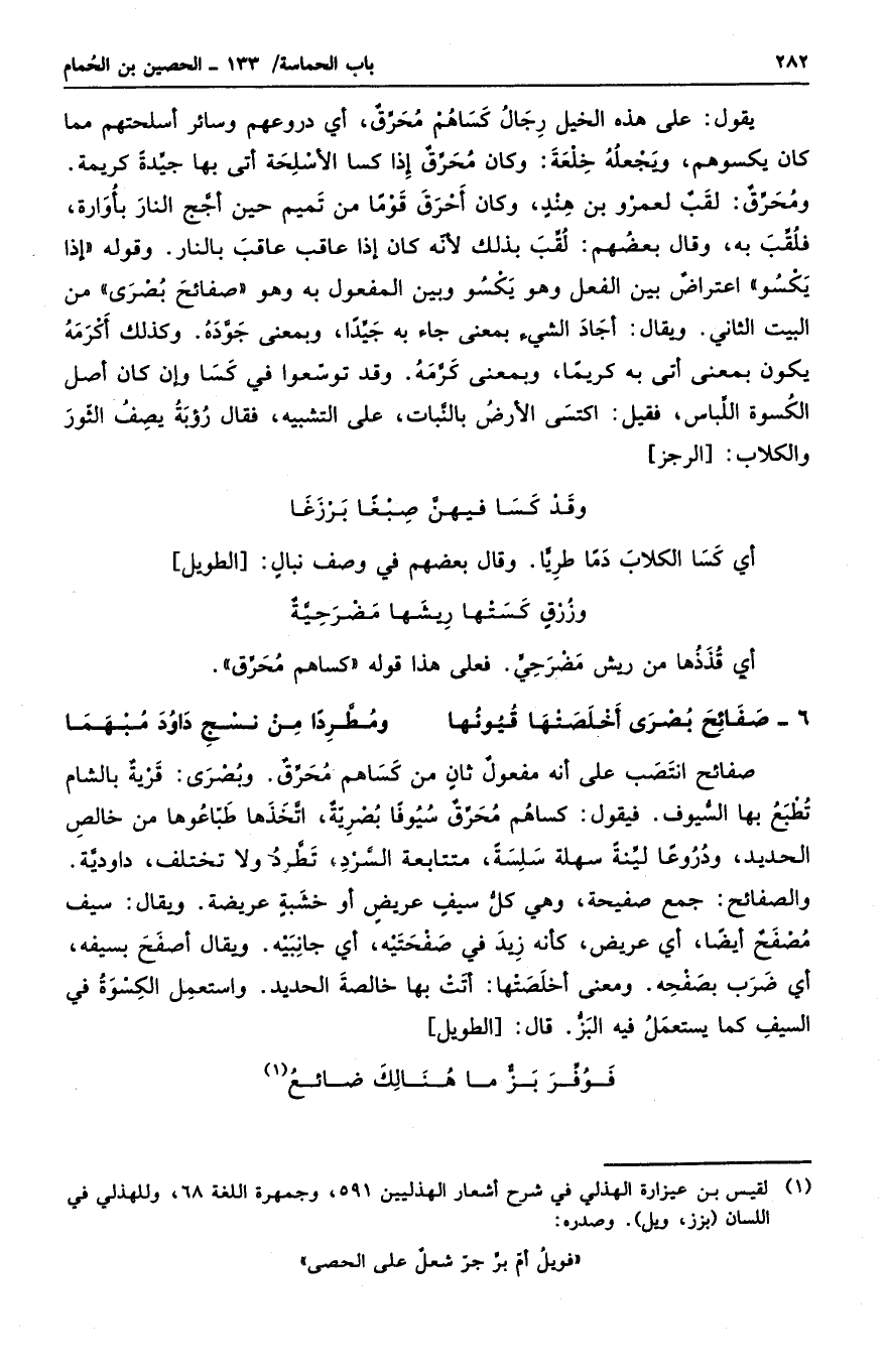 صفائح انتصب على أنه مفعولٌ ثان من كساهم محرقٌ. وبصرى: قريةٌ بالشام تطبع بها السيوف. فيقول: كساهم محرقٌ سيوفاً بصريةٌ، اتخذها طباعوها من خالص الحديد، ودروعاً لينةً سهلة سلسةً، متتابعة السرد، تطرد ولا تختلف، داودية. والصفائح: جمع صفيحة، وهي كل سيفٍ عريضٍ أو خشبةٍ عريضة. ويقال سيف مصفحٌ أيضاً، أي عريض، كأنه زيد في صفحتيه، أي جانبيه. ويقال أصفح بسيفه، أي ضرب بصفحه. ومعنى أخلصتها: أتت بها خالصة الحديد. واستعمل الكسوة في السيف كما يستعمل فيه البز. قال: