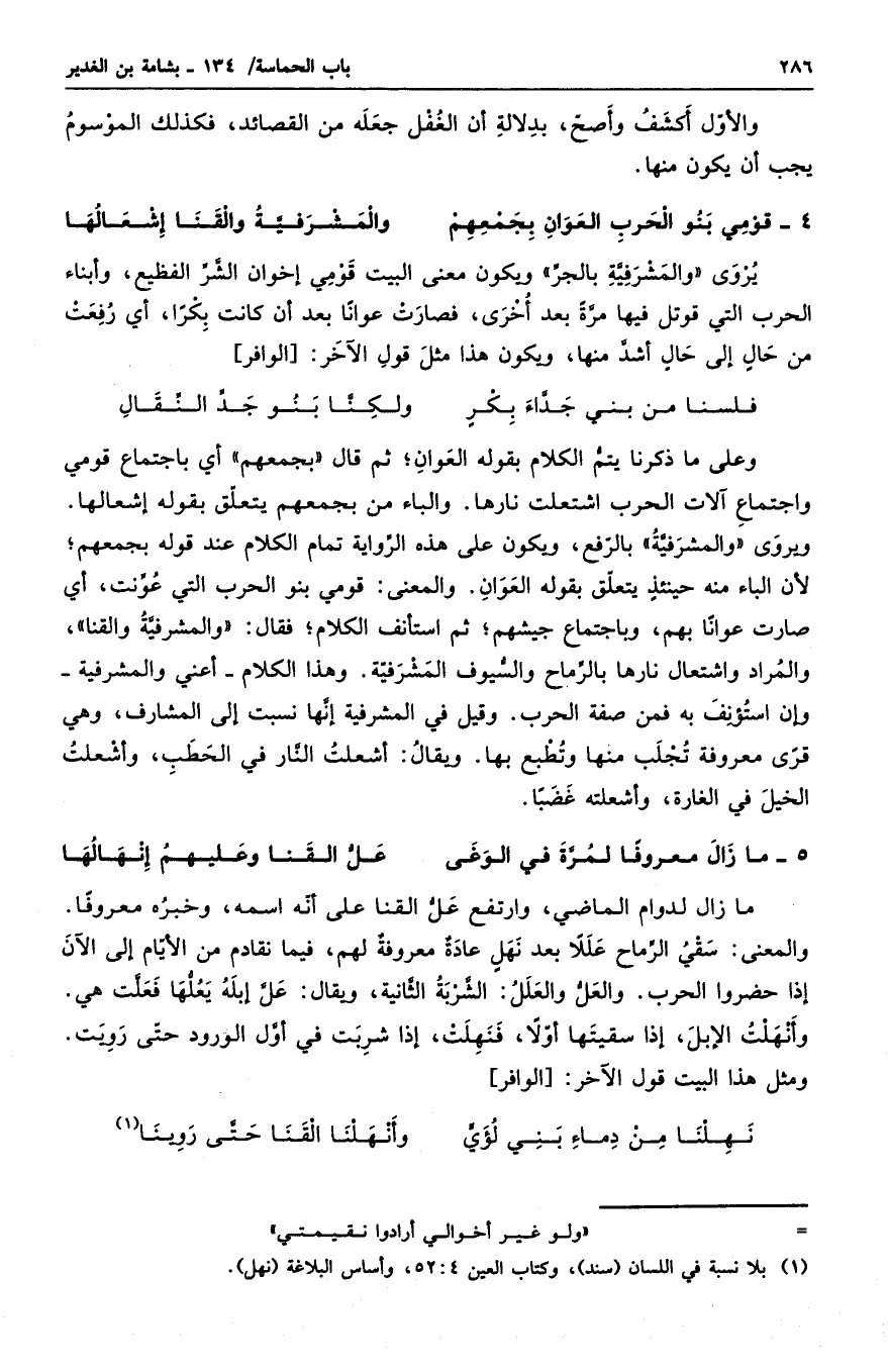 وعلى ما ذكرنا يتم الكلام بقوله العوان؛ ثم قال " بجمعهم " أي باجتماع قومي واجتماع آلات الحرب اشتعلت نارها. والباء من بجمعهم يتعلق بقوله إشعالها. ويروى " والمشرفية " بالرفع، ويكون على هذه الرواية تمام الكلام عند قوله بجمعهم؛ لأن الباء منه حينئذٍ يتعلق بقوله العوان. والمعنى: قومي بنو الحرب التي عونت، أي صارت عواناً بهم، وباجتماع جيشهم؛ ثم استأنف الكلام؛ فقال: " والمشرفية والقنا "، والمراد واشتعال نارها بالرماح والسيوف المشرفية. وهذا الكلام - أعني والمشرفية - وإن استؤنف به فمن صفة الحرب. وقيل في المشرفية إنها نسبت إلى المشارف، وهي قوىً معروفة تجلب منها وتطبع بها. ويقال: أشعلت النار في الحطب، وأشعلت الخيل في الغارة، وأشعلته غضباً.