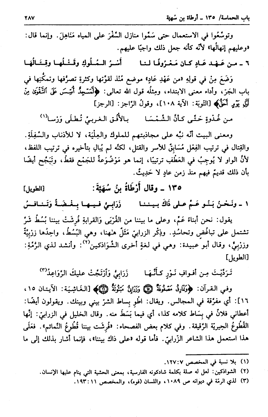 ومعنى البيت أنه نبه على مجاذبتهم للملوك والعلية، لا للأذناب والسفلة. والقتال في ترتيب الفعل مسابق للأسر والقتل، لكنه لم يبال بتأخيره في ترتيب اللفظ، لأن الواو لا يوجب في العطف ترتيباً، إنما هو موضوعةٌ للجمع فقط، وتبجح أيضاً بأن ذلك قديمٌ فيهم منذ زمن عادٍ لا حديثٌ.