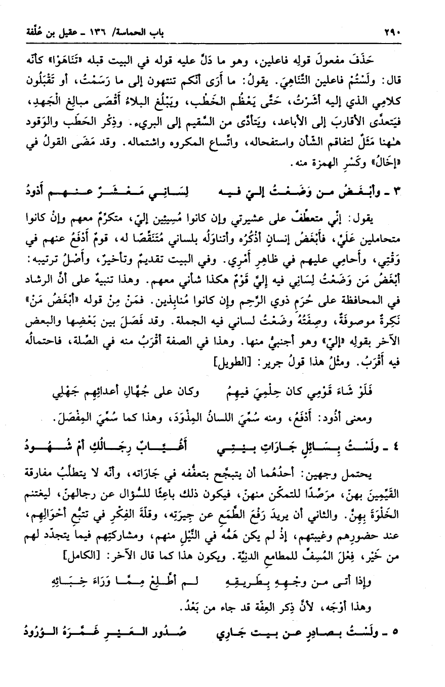 يقول: إني متعطفٌ على عشيرتي وإن كانوا مسيئين إلي، متكرمٌ معهم وإن كانوا متحاملين علي، فأبغض إنسانٍ أذكره وأتناوله بلساني متنقصاً له، قومٌ أدفع عنهم في وقتي، وأحامي عليهم في ظاهري أمري. وفي البيت تقديمٌ وتأخيرٌ، وأصل ترتيبه: أبغض من وضعت لساني فيه إلى قومٌ هكذا شأني معهم. وهذا تنبيهٌ على أن الرشاد في المحافظة على حرم ذوي الرحم وإن كانوا منابذين. فمن من قوله " أبغض من " نكرةٌ موصوفةٌ، وصفته وضعت لساني فيه الجملة. وقد فصل بين بعضها والبعض الآخر بقوله " إلي " وهو أجنبي منها. وهذا في الصفة أقرب منه في الصلة، فاحتماله فيه أقرب. ومثل هذا قول جرير: