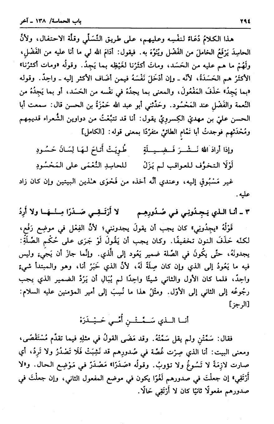 هذا الكلام دعاءٌ لنفسه وعلهيم، على طريق التسلي وقلة الاحتفال، ولأن الحاسد يرفع الخامل من الفضل وينود به. فيقول: أدام الله لي ما أنا عليه من الفضل، ولهم ما هم عليه من الحسد، ومات أكثرنا لغيظه بما يجد. وقوله " ومات أكثرنا " الأكثر هم الحسدة، لأنه - وإن أدخل نفسه فيمن أضاف الأكثر إليه - واحدٌ. وقوله " بما يجد " حذف المفعول، والمعنى بما يجده في نفسه من الحسد، أو بما يجده من النعمة والفضل عند المحسود. وحدثني أبو عبد الله حمزة بن الحسن قال: سمعت أبا الحسن علي بن مهدي الكسروي يقول: أنا قد تتبعت من دواوين الشعراء قديمهم ومحدثهم فوجدت أبا تمامٍ الطائي متفرداً بمعنى قوله:
