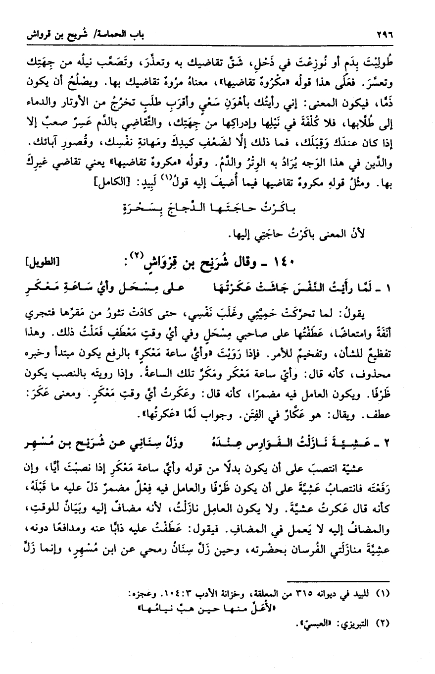 طولبت بدمٍ أو نوزعت في ذحل، شق تقاضيك به وتعذر، وتصعب نيله من جهتك وتعسر. فعلى هذا قوله " مكروهٌ تقاضيها "، معناه مروهٌ تقاضيك بها. ويصلح أن يكون ذماً، فيكون المعنى: إني رأيتك بأهون سعيٍ وأقرب طلبٍ تخرج من الأوتار والدماء إلى طلابها، فلا كلفة في نيلها وإدراكها من جهتك، والتقاضي بالدم عسرٌ صعبٌ إلا إذا كان عندك وقبلك، فما ذلك إلا لضعف كيدك ومهانة نفسك، وقصور آبائك. والدين في هذا الوجه يراد به الوتر والدم. وقوله " مكروهٌ تقاضيها " يعني تقاضي غيرك بها. ومثل قوله مكروهٌ تقاضيها فيما أضيف إليه قول لبيدٍ: