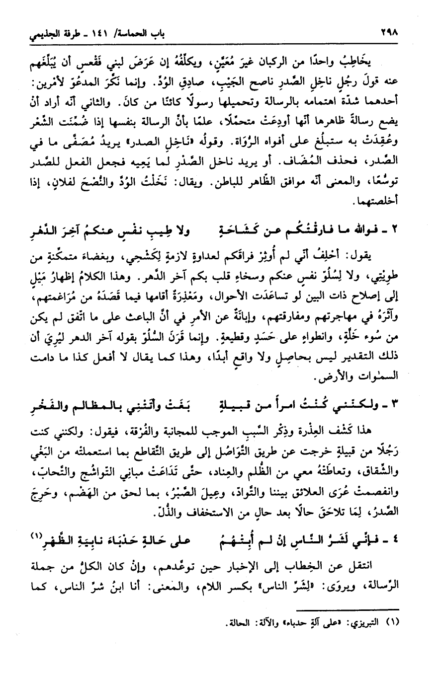 هذا كشف العذرة وذكر السبب الموجب للمجانبة والفرقة، فيقول: ولكنني كنت رجلاً من قبيلةٍ خرجت عن طريق التواصل إلى طريق التقاطع بما استعملته من البغي والشقاق، وتعاطته معي من الظلم والعناد، حتى تداعت مباني التواشج والتحاب، وانفصمت عرى العلائق بيننا والتواد، وعيل الصبر، بما لحق من الهضم، وحرج الصدر، لما تلاحق حالاً بعد حالٍ من الاستخفاف والذل.