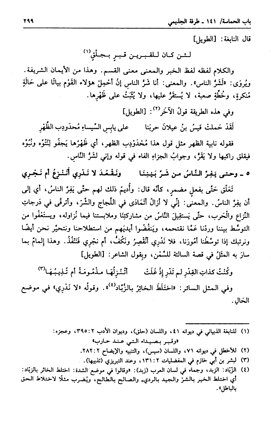 تعلق حتى بفعلٍ مضمرٍ، كأنه قال: وأديم ذلك لهم حتى يفر الناس، أي إلى أن يفر الناس. والمعنى: إني لا أزال أتمادى في اللجاج والشر، وأترقى في درجات النزاع والحرب، حتى يسقيل الناس من مشاركتنا وملابستنا فيما نزاوله، ويستعفوا من التوسط بيننا وردنا عما نقتحمه، وينفضوا أيديهم من استطلاحنا ونتحير نحن أيضاً ونرتبك إذا توسطنا أمورنا فلا ندري أنقصر ونكف، أم نجري فننفذ. وهذا إلمامٌ بما سار به المثل في قصة السالئة للسمن، وبقول الشاعر: