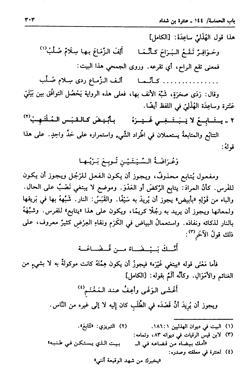 ومفعول يتابع محذوفٌ، ويجوز أن يكون الفعل للرجل ويجوز أن يكون للفرس. كأن المراد: يتابع الركض أو العدو. وموضع لا يبتغي نصبٌ على الحال. والباء من قوله " بأبيض " يجوز أن يريد به سيفاً. والقبس: النار. شبهه بها في بريقها ولمعانها ويجوز أن يريد به رجلاً كريما، ويكون على هذا " يتابع " للفرس. وشبهه بالنار لذكائه ونفاذه. واستعمال البياض في الكرم ونقاء العرض كثيرٌ معروف، على ذلك قول الآخر: