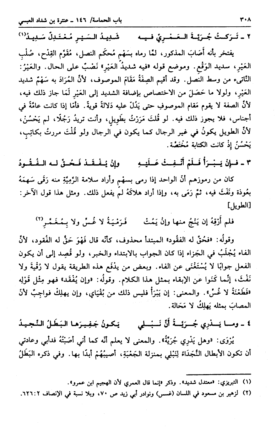 يفتخر بأنه أصاب المذكور، لما رماه بسهمٍ محكم النصل، مقوم القدح، صلب العير، سديد الوقع. وموضع قوله " فيه شديد العير " نصب على الحال. والعير: الناتئ من وسد النصل. وقد أقيم الصفة مقام الموصوف، لأن المراد به سهمٌ شديد العير. ولولا ما حصل من الاختصاص بإضافة الشديد إلى العير لما جاز ذلك فيه، لأن الصفة لا يقوم مقام الموصوف حتى يدل عليه دلالةً قويةً. فأما إذا كانت عامةً في أجناس، فلا يجوز ذلك فيه. لو قلت مررت بطويلٍ، وأنت تريد رجلاً، لم يحسن، لأن الطويل يكون في غير الرجال كما يكون في الرجال. ولو قلت مررت بكاتبٍ، يحسن إذ كانت الكتابة مختصة.