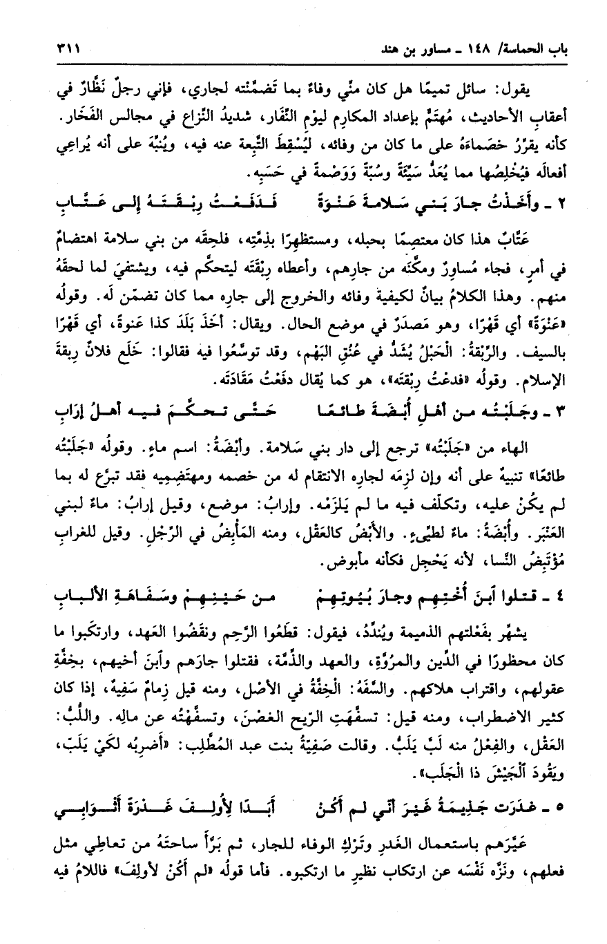عتاب هذا كان معتصماً بحبله، ومستظهراً بذمته، فلحقه من بني سلامة اهتضامٌ في أمرٍ، فجاء مساورٌ ومكنه من جارهم، وأعطاه ربقته ليتحكم فيه، ويشتفي لما لحقه منهم. وهذا الكلام بيانٌ لكيفية وفائه والخروج إلى جاره مما كان تضمن له. وقوله " عنوةً " أي قهراً، وهو مصدرٌ في موضع الحال. ويقال: أخذ بلد كذا عنوةً، أي قهراً بالسيف. والربقة: الحبل يشد في عنق البهم، وقد توسعوا فيه فقالوا: خلع فلانٌ ربقة الإسلام. وقوله فدفعت ربقته "، هو كما يقال دفعت مقادته.