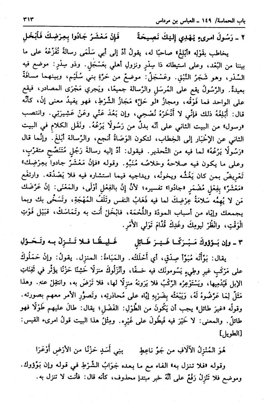 يخاطب بقوله " أبلغ " صاحباً له، يقول أد إلى أبي سلمى رسالةً تفزعه على ما بيننا من البعد، وعلى استيطانه ذا سدرٍ ونزول أهلي بعسجلٍ. وذو سدرٍ: موضع فيه السدر، وهو شجر النبق. وعسجلٌ: موضعٌ من حرة بني سليم، وبينهما مسافةٌ بعيدةٌ. والرسول يقع على المراسل والرسالة جميعاً، ويجري مجرى المصادر، فيقع على الواحد فما فوقه، ومجاز " لوحل " مجاز الشرط، فهو يفيد معنى إن، كأنه قال: أبلغه ذلك فإني لا أذخره نصحي، وإن بعد عني وعن عشيرتي. وانتصب " رسول " من البيت الثاني على أنه بدل من رسولاً يرعه. ونقل الكلام في البيت الثاني عن الإخبار إلى الخطاب، لتكون الوصاة أنجع، والرسالة أبلغ. وإنما قال " رسولاً يرعه " لما فيه من التحذير. فيقول: أد إليه رسالة رجلٍ منتصحٍ متقربٍ، وعلى ما يكون فيه صلاحه وخلاصه منبهٍ. وقوله " فإن معشرٌ جادوا بعرضك " تعريضٌ بمن كان يغشه ويخونه، ويداجيه فيما استشاره فيه فلا يصدقه. وارتفع " معشرٌ " بفعلٍ مضمرٍ " جادوا " تفسيره؛ لأن إن بالفعل أولى، والمعنى: إن عرضك من لا يهمه سلامة عرضك لما فيه ذهاب النفس وتلف المهجة، وتسخى بك وبما يجمعك وإياه من أسباب المودة واللحمة، فابخل أنت به وتماسك، قبيل فوت الوقت، وانظر ليومك وغدك قدام تولي الأمر.