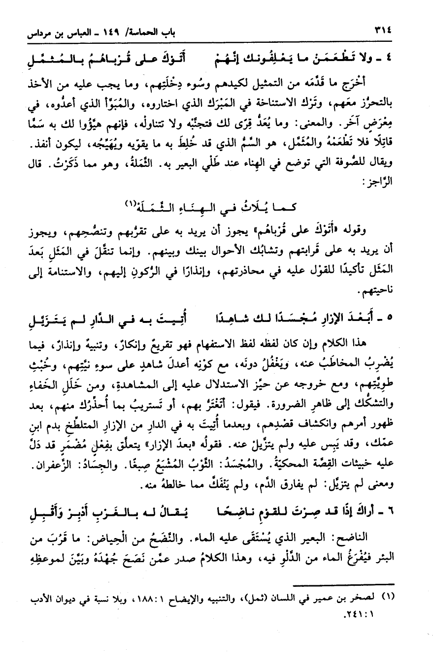 أخرج ما قدمه من التمثيل لكيدهم وسوء دخلتهم، وما يجب عليه من الأخذ بالتحرز معهم، وترك الاستناخة في المبرك الذي اختاروه، والمبوأ الذي أعدوه، في معرضٍ آخرٍ. والمعنى: وما يعد قرىً لك فتجنبه ولا تتناوله، فإنهم هيئوا لك به سماً قاتلاً فلا تطعمه والمثمل، هو السم الذي قد خلط به ما يقويه ويهيجه، ليكون أنفذ. ويقال للصوفة التي توضع في الهناء عند طلي البعير به. الثملة، وهو مما ذكرت. قال الزاجز: