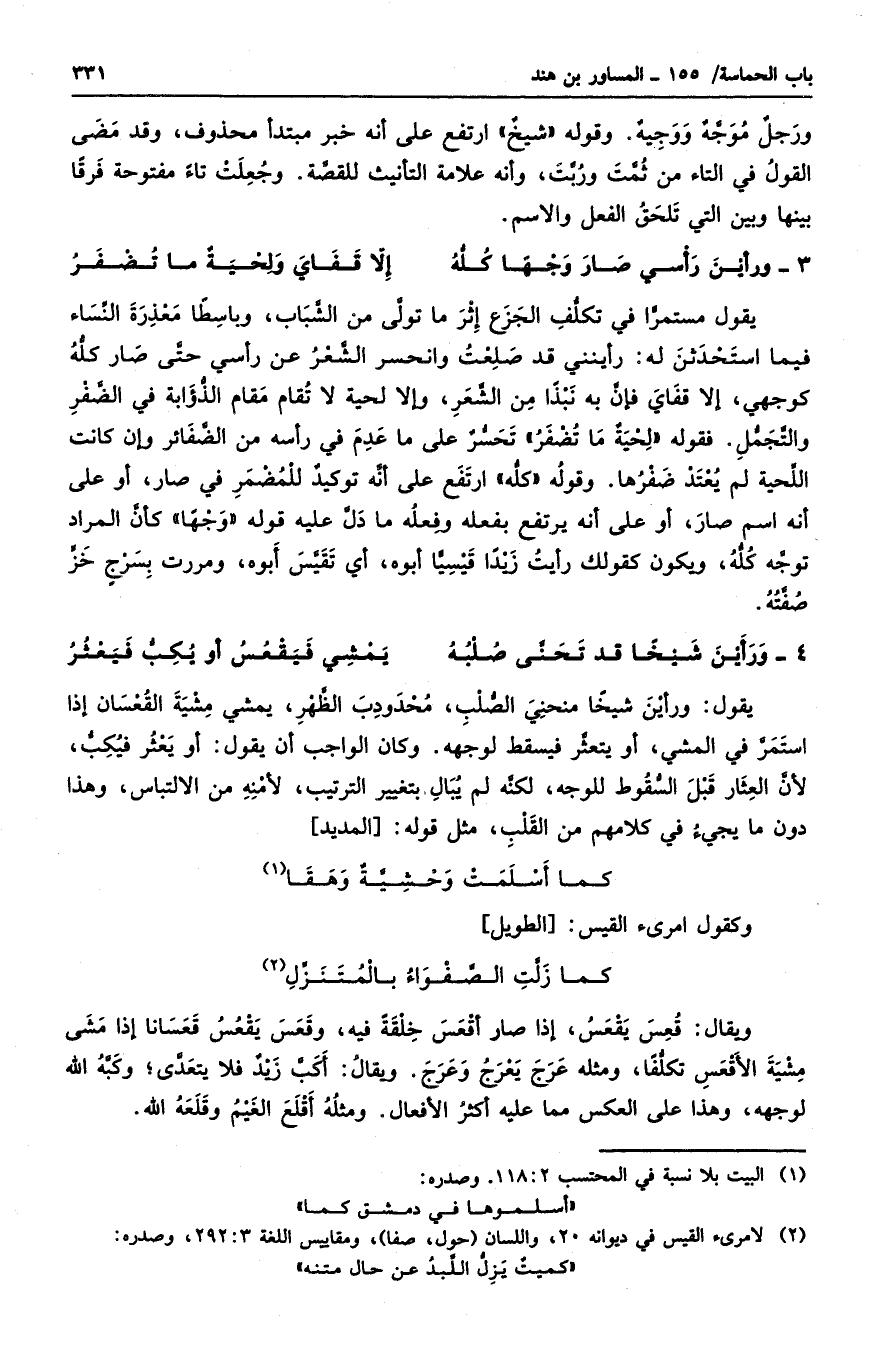 يقول: ورأين شيخاً منحني الصلب، محدودب الظهر، يمشي مشية القعسان إذا استمر في المشي، أو يتعثر فيسقط لوجهه. وكان الواجب أن يقول: أو يعثر فيكب، لأن العثار قبل السقوط للوجه، لكنه لم يبال بتغيير الترتيب، لأمنه من الالتباس، وهذا دون ما يجيء في كلامهم من القلب، مثل قوله: