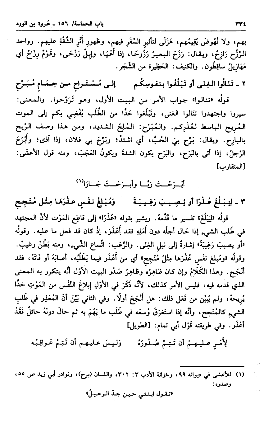قوله " تنالوا " جواب الأمر من البيت الأول، وهو تروحوا. والمعنى: سيروا واجتهدوا تنالو الغنى، وتبلغوا حداً من الطلب يفضي بكم إلى الموت المريح الباسط لعذركم. والمبرح: الملح الشديد، ومن هذا وصف الريح بالبارح. ويقال: برح بي الحب، أي اشتد؛ وبرح بي فلان، إذا آذى؛ وأبرح الرجل، إذا أتى بالبرح، والبرح يكون الشدة ويكون العجب، ومنه قول الأعشى: