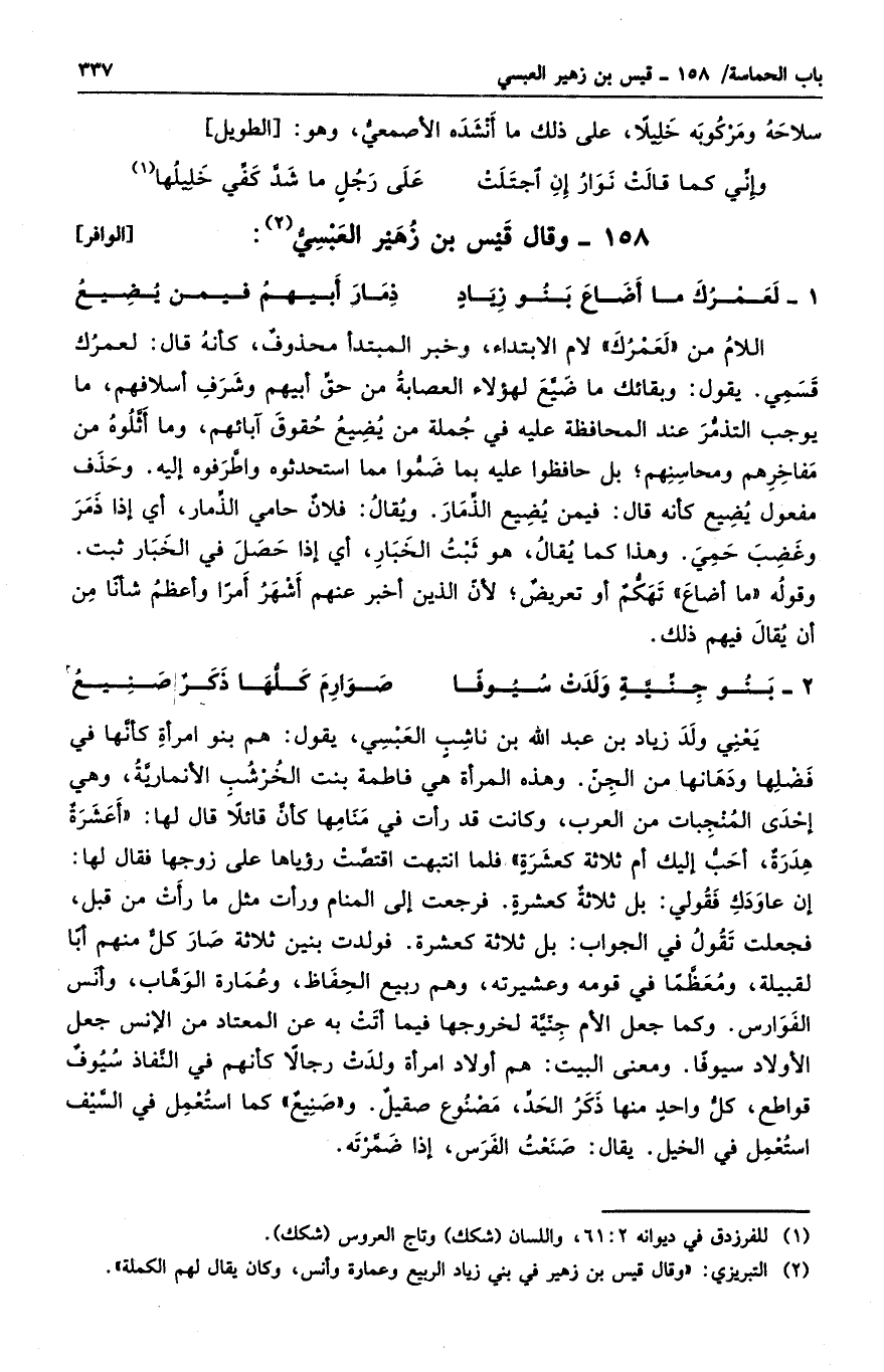 يعني ولد زياد بن عبد الله بن ناشبٍ العبسي، يقول: هم بنو امرأة كأنها في فضلها ودهائها من الجن. وهذه المرأة هي فاطمة بنت الخرشب الأنمارية، وهي إحدى المنجبات من العرب، وكانت قد رأت في منامها كأن قائلاً قال لها: " أعشرةٌ هدرةٌ، أحب إليك أم ثلاثة كعشرةٍ " فلما انتبهت اقتصت رؤياها على زوجها فقال لها: إن عاودك فقولي: بل ثلاثةٌ كعشرةٍ. فرجعت إلى المنام ورأت مثل ما رأت من قبل، فجعلت تقول في الجواب: بل ثلاثة كعشرة. فولدت بنين ثلاثة صار كلٌ منهم أباً لقبيلة، ومعظماً في قومه وعشيرته، وهم ربيع الحفاظ، وعمارة الوهاب، وأنس الفوارس. وكما جعل الأم جنية لخروجها فيما أتت به عن المعتاد من الإنس جعل الأولاد سيوفاً. ومعنى البيت: هم أولاد امرأة ولدت رجالاً كأنهم في النفاذ سيوفٌ قواطع، كل واحدٍ منها ذكر الحد، مصنوع صقيلٌ. و " صنيعٌ " كما استعمل في السيف استعمل في الخيل. يقال صنعت الفرس، إذا ضمرته.