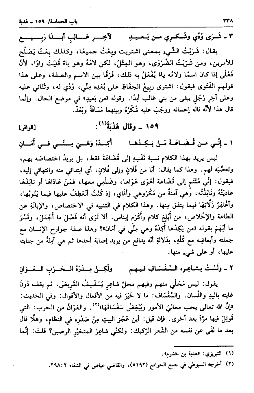 يقال: شربت الشيء بمعنى اشتريت وبعت جميعاً، وكذلك بعت يصلح للأمرين، ومن شريت الضروري، وهو المثل، لكن لامه وهو ياءٌ قلبت واواً، لأن فعلى إذا كان اسماً ولامه ياءٌ يفعل به ذلك، فرقاً بين الاسم والصفة. وعلى هذا قولهم الفتوى. فيقول: اشترى ربيع الحفاظ على بعده مني، ودي له، وثنائي عليه وعلى آخر رجلٍ يبقى من بني غالب أبداً. وقوله " من بعيدٍ " في موضع الحال. وإنما قال هذا لأنه ناله إحسانه ووجب عليه شكره وبينهما مسافةٌ وبعدٌ.