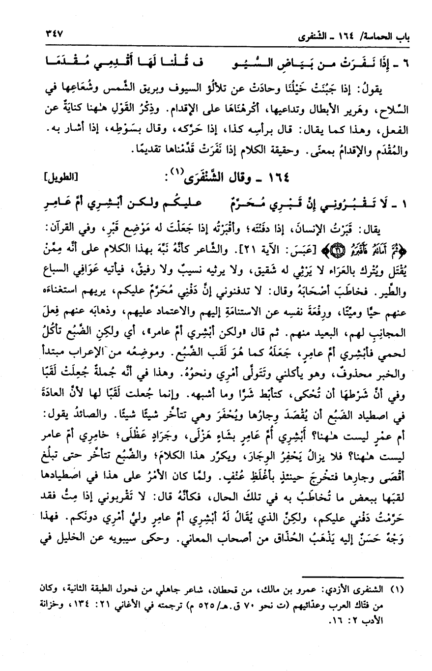 يقال: قبرت الإنسان، إذا دفنته؛ وأقبرته إذا جعلت له موضع قبرٍ، وفي القرآن: " ثم أماته فأقبره ". والشاعر كأنه نبه بهذا الكلام على أنه ممن يقتل ويترك بالعراء لا يرثي له شقيق، ولا يرثه نسيبٌ ولا رفيقٌ، فيأتيه عوافي السباع والطير. فخاطب أصحابه وقال: لا تدفنوني إن دفني محرمٌ عليكم، يريهم استغناءه عنهم حياً وميتاً، ورفعة نفسه عن الاستنامة إليهم والاعتماد عليهم، وذهابه عنهم فعل المجانب لهم، البعيد منهم. ثم قال " ولكن أبشري أم عامر "، أي ولكن الضبع تأكل لحمي فأبشري أم عامر، جعله كما هو لقب الضبع. وموضعه من الإعراب مبتدأ والخبر محذوفٌ، وهو يأكلني وتتولى أمري ونحوه. وهذا في أنه جملةٌ جعلت لقباً وفي أن شرطها أن تحكى، كتأبط شراً وما أشبهه. وإنما جعلت لقباً لها لأن العادة في اصطياد الضبع أن يقصد وجارها ويحفر وهي تتأخر شيئاً شيئاً. والصائد يقول: أم عمرٍ ليست ها هنا؟ أبشري أم عامرٍ بشاءٍ هزلى، وجرادٍ عظلى؛ خامري أم عامر ليست ها هنا؟ فلا يزال يحفر الوجار، ويكرر هذا الكلام؛ والضبع تتأخر حتى تبلغ أقصى وجارها فتخرج حينئذٍ بأغلظ عنفٍ. ولما كان الأمر على هذا في اصطيادها لقبها ببعض ما تخاطب به في تلك الحال، فكأنه قال: لا تقربوني إذا مت فقد حرمت دفني عليكم، ولكن الذي يقال له أبشري أم عامرٍ ولي أمري دونكم. فهذا وجهٌ حسنٌ إليه يذهب الحذاق من أصحاب المعاني. وحكى سيبويه عن الخليل في