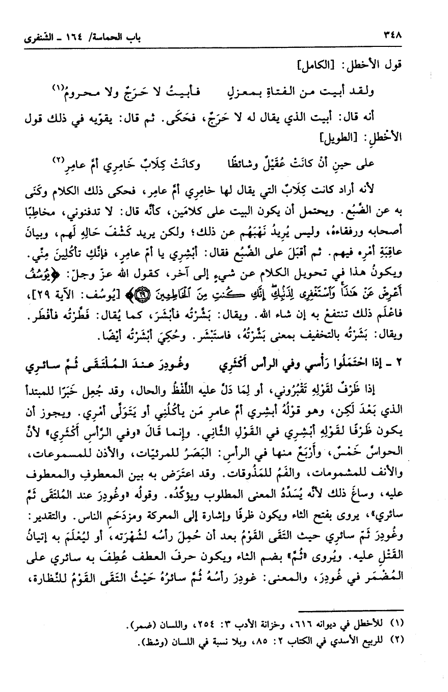 لأنه أراد كانت كلابٌ التي يقال لها خامري أم عامر، فحكى ذلك الكلام وكنى به عن الضبع. ويحتمل أن يكون البيت على كلامين، كأنه قال: لا تدفنوني، مخاطباً أصحابه ورفقاءه، وليس يريد نهيهم عن ذلك؛ ولكن يريد كشف حاله لهم، وبيان عاقبة أمره فيهم. ثم أقبل على الضبع فقال: أبشري يا أم عامرٍ، فإنك تأكلين مني. ويكون هذا في تحويل الكلام عن شيءٍ إلى آخر، كقول الله عز وجل: " يوسف أعرض عن هذا واستغفري لذنبك إنك كنت من الخاطئين "، فاعلم ذلك تنتفع به إن شاء الله. ويقال بشرته فأبشر، كما يقال فطرته فأفطر. ويقال بشرته بالتخفيف بمعنى بشرته، فاستبشر. وحكى أبشرته أيضاً.