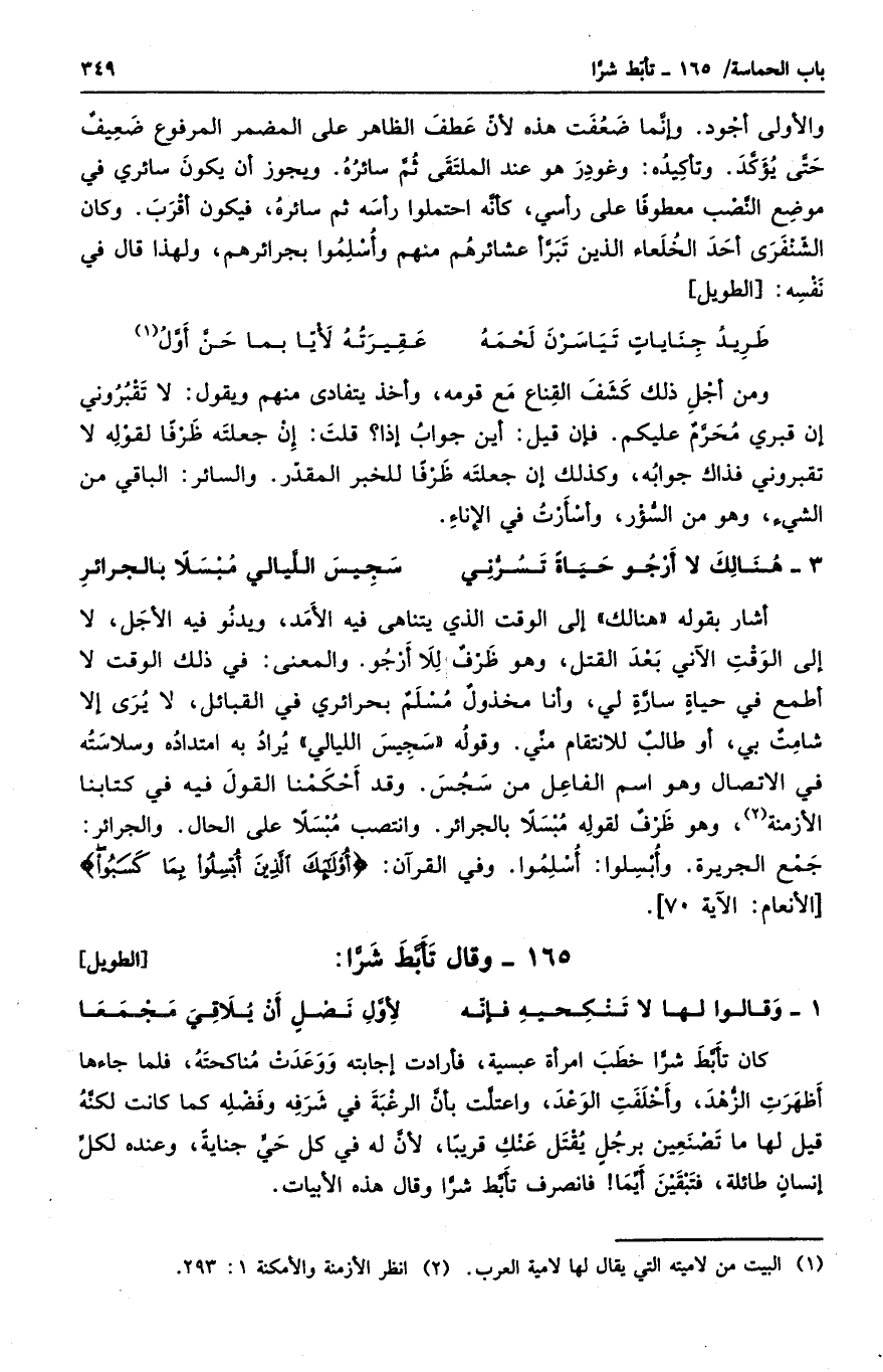 أشار بقوله " هنالك " إلى الوقت الذي يتناهى فيه الأمد، ويدنو فيه الأجل، لا إلى الوقت الآني بعد القتل، وهو ظرفٌ للا أرجو. والمعنى: في ذلك الوقت لا أطمع في حياةٍ سارةٍ لي، وأنا مخذولٌ مسلمٌ بجرائري في القبائل، لا يرى إلا شامتٌ بي، أو طالبٌ للانتقام مني. وقوله " سجيس الليالي " يراد به امتداده وسلاسته في الاتصال وهو اسم الفاعل من سجس. وقد أحكمنا القول فيه في كتابنا الأزمنة. وهو ظرفٌ لقوله مبسلاً بالجرائر. وانتصب مبسلاً على الحال. والجرائر: جمع الجريرة. وأبسلوا: أسلموا. وفي القرآن " ألئك الذين أبسلوا كسبوا ".