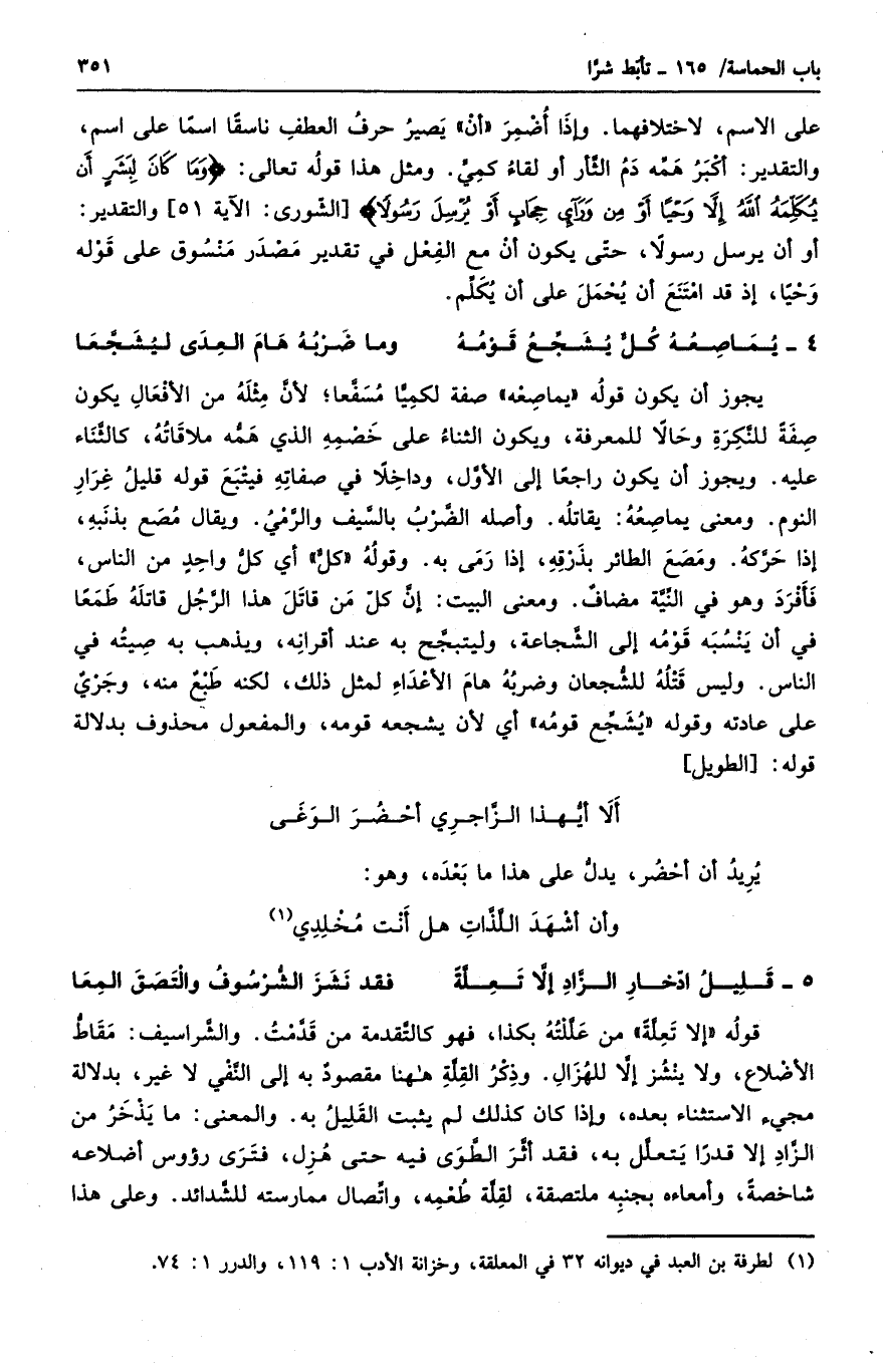 قوله " إلا تعلةً " من عللته بكذا، فهو كالتقدمة من قدمت. والشراسيف: مقاط الأضلاع، ولا ينشز إلا للهزال. وذكر القلة ها هنا مقصودٌ به إلى النفي لا غير، بدلالة مجيء الاستثناء بعده، وإذا كان كذلك لم يثبت القليل به. والمعنى: ما يذخر من الزاد إلا قدراً يتعلل به، فقد أثر الطوى فيه حتى هزل، فترى رءوس أضلاعه شاخصةً، وأمعاءه بجنبه ملتصقة، لقة طعمه، واتصال ممارسته للشدائد. وعلى هذا