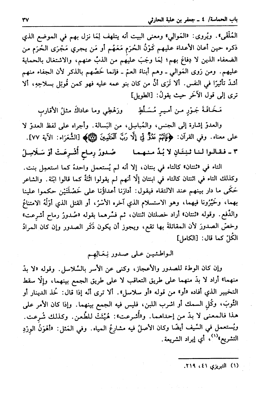 وإن كان الوطء للصدور والأعجاز. وكنى عن الأسر بالسلاسل. وقوله " لا بد منهما " أراد لا بد منهما على طريق التعاقب لا على طريق الجمع بينهما، وإلا سقط التخيير الذي أفاده " أو " من قوله " أو سلاسل ". ألا ترى أنه إذا قال خذ الدينار أو الثوب، وكل السمك أو اشرب اللبن، فليس فيه الجمع بينهما. وإذا كان الأمر على هذا فالمعنى لا بد من إحداهما. و " أشرعت ": هيئت للطعن. وكذلك شرعت. ويستعمل في السيف أيضاً وكان الأصل فيه مشارع المياه. وفي المثل: " أهون الورد التشريع "، أي إيراد الشريعة.