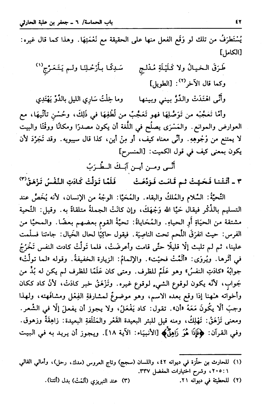 التحية: السلام والملك والبقاء. والمحيا: الوجه من الإنسان، لأنه يخص عند التسليم بالذكر فيقال حيا الله وجهك، وإن كانت الجملة متلقاةً به. وقيل التحية مشتقة من الحياة أوالحياء. والمحاياة: تحية القوم بعضهم بعضا. والمحيا من الفرس: حيث انفرق اللحم تحت الناصية. فيقول حاكياً لحال الخيال: جاءتنا فسلمت علينا، ثم لم تلبث إلا قليلاً حتى قامت وأعرضت، فلما تولت كادت النفس تخرج في أثرها. ويروى: " ألمت فحيت ". والإلمام: الزيارة الخفيفة. وقوله " لما تولت " جوابه " كادت النفس " وهو علمٌ للظرف. ومتى كان علماً للظرف لم يكن له بدٌ من جوابٍ، لأنه يكون لوقوع الشيء لوقوع غيره. وتزهق خبر كادت، لأن كاد ككان وأخواته ها هنا إذا وقع بعده الاسم، وهو موضوعٌ لمشارفة الفعل ومشافهته، ولهذا وجب ألا يكون معه " أن ". تقول: كاد يفعل، ولا يجوز أن يفعل إلا في الشعر. ومعنى تزهق: تهلك، ومنه قيل للبئر البعيدة القعر والمتلفة البعيدة: زاهقةٌ وزهوق. وفي القرآن: " فإذا هو زاهقٌ ". ويجوز أن يريد به في البيت