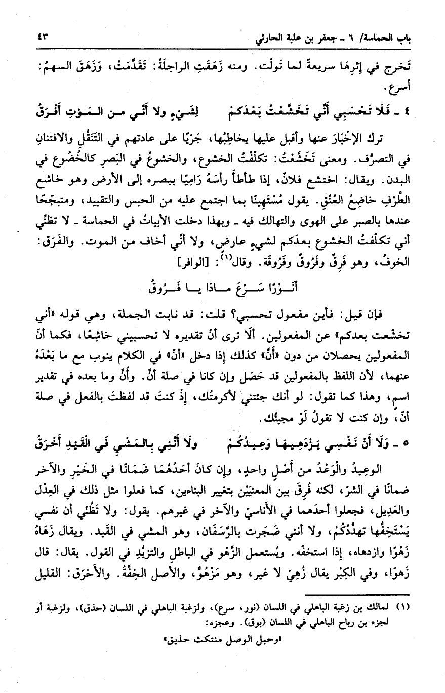 ترك الإخبار عنها وأقبل عليها يخاطبها، جرياً على عادتهم في التنقل والافتنان في التصرف. ومعنى تخشعت: تكلفت الخشوع. والخشوع في البصر كالخضوع في البدن. ويقال: اختشع فلانٌ، إذا طأطأ رأسه رامياً ببصره إلى الأرض وهو خاشع الطرف خاضع العنق. يقول مستهيناً بما اجتمع عليه من الحبس والتقييد، ومتبجحاً عندها بالصبر على الهوى والتهالك فيه - وبهذا دخلت الأبيات في الحماسة - لا تظني أني تكلفت الخشوع بعدكم لشيءٍ عارضٍ، ولا أني أخاف من الموت. والفرق: الخوف، وهو فرقٌ وفروقٌ وفروقة. وقال: