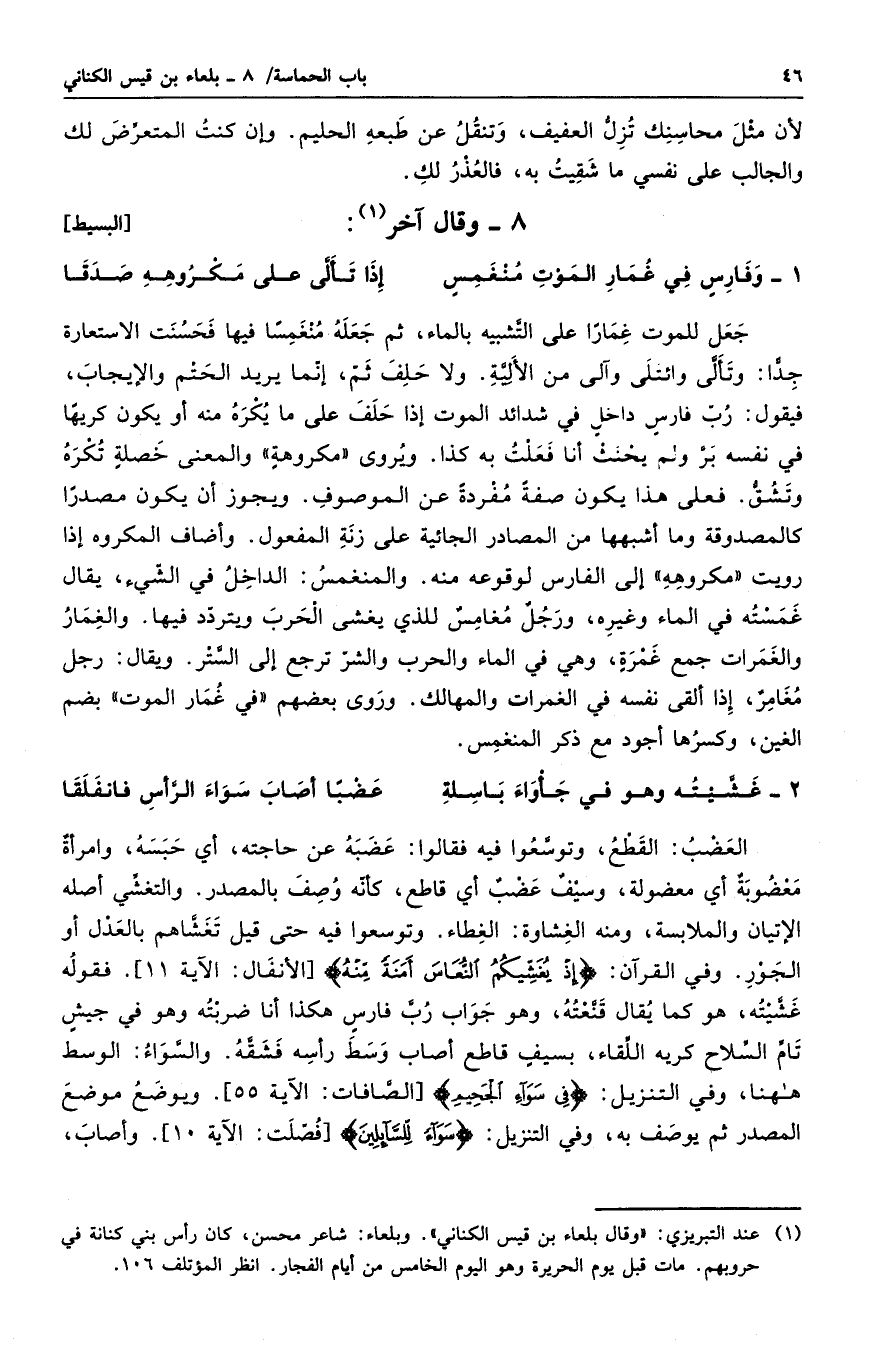 جعل للموت غماراً على التشبيه بالماء، ثم جعله منغمساً فيها فحسنت الاستعارة جداً: وتألى وائتل وآلى من الألية. ولا حلف ثم، إنما يريد الحتم والإيجاب، فيقول: رب فارسٍ داخلٍ في شدائد الموت إذا حلف على ما يكره منه أو يكون كريهاً في نفسه بر ولم يحنث أنا فعلت به كذا. ويروي " مكروهةٍ " والمعنى خصلة تكره وتشق. فعلى هذا يكون صفةً مفردةً عن الموصوف. ويجوز أن يكون مصدراً كالمصدوقة وما أشبهها من المصادر الجائية على زنة المفعول. وأضاف المكروه إذا رويت " مكروهه " إلى الفارس لوقوعه منه. والمنغمس: الداخل في الشيء، يقال غمسته في الماء وغيره، ورجلٌ مغامسٌ للذي يغشى الحرب ويتردد فيها. والغمار والغمرات جمع غمرةٍ، وهي في الماء والحرب والشر ترجع إلى الستر. ويقال رجل مغامرٌ، إذا ألقى نفسه في الغمرات والمهالك. وروى بعضهم " في غمار الموت " بضم الغين، وكسرها أجود مع ذكر المنغمس.