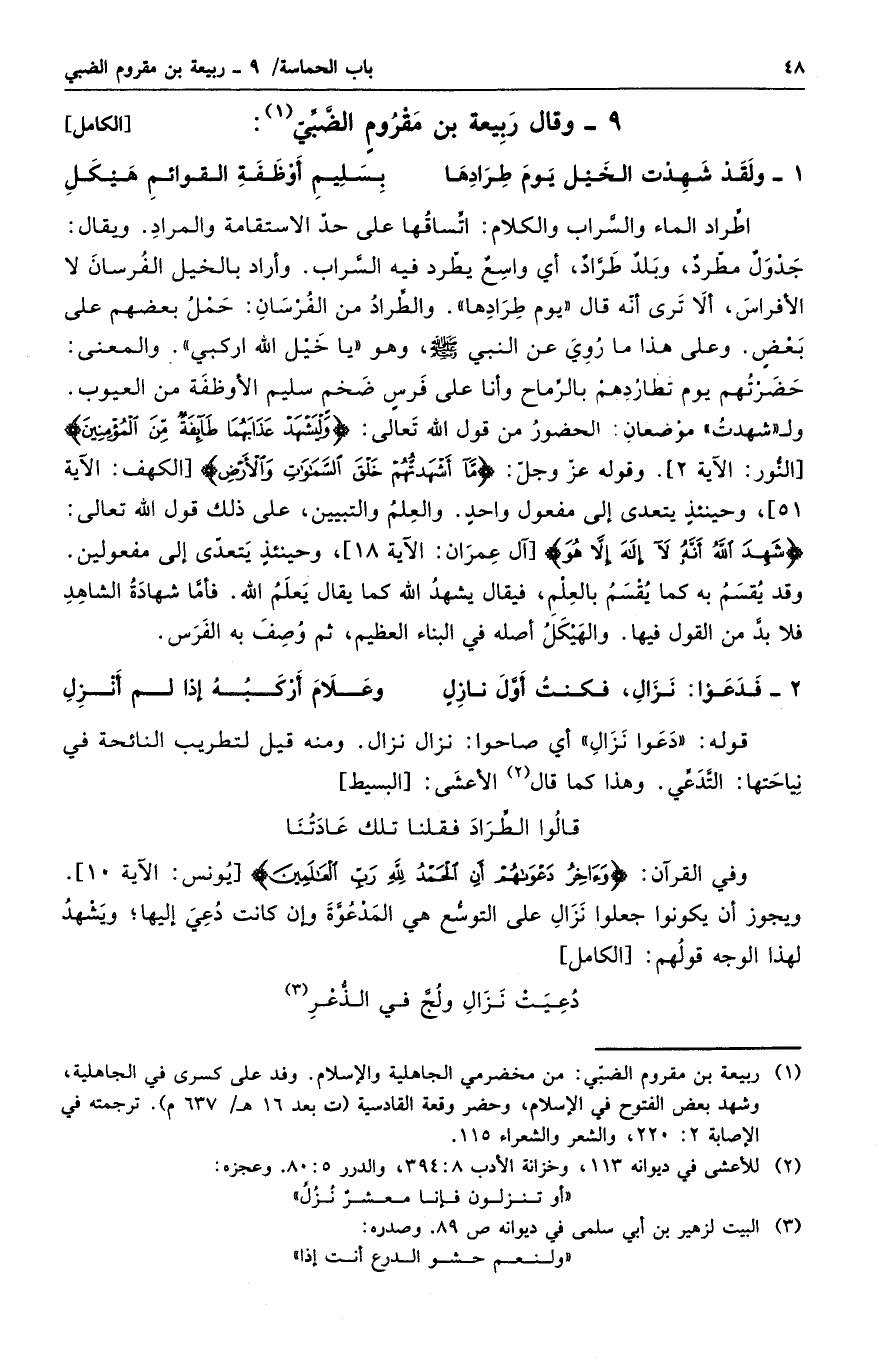 اطراد الماء والسراب والكلام: اتساقها على حد الاستقامة والمراد. ويقال: جدولٌ مطردٌ، وبلدٌ طرادٌ، أي واسعٌ يطرد فيه السراب. وأراد بالخيل الفرسان لا الأفراس، ألا ترى أنه قال " يوم طرادها ". والطراد من الفرسان: حمل بعضهم على بعضٍ. وعلى هذا ما روي عن النبي صلى الله عليه وسلم، وهو " يا خيل الله اركبي ". والمعنى حضرتهم يوم تطاردهم بالرماح وأنا على فرسٍ ضخمٍ سليم الأوظفة من العيوب. ول " شهدت " موضعان: الحضور من قول الله تعالى: " وليشهد عذابهما طائفةٌ من المؤمنين ". وقوله عز وجل: " ما أشهدتم خلق السموات والأرض "، وحينئذ يتعدى إلى مفعول واحدٍ. والعلم والتبيين، على ذلك قول الله تعالى: " شهد الله أنه لا إله إلا هو "، وحينئذ يتعدى إلى مفعولين. وقد يقسم به كما يقسم بالعلم، فيقال يشهد الله كما يقال يعلم الله. فأما شهادة الشاهد فلابد من القول فيها. والهيكل أصله في البناء العظيم، ثم وصف به الفرس.