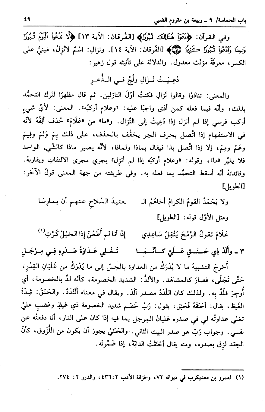والمعنى تنادوا وقالوا نزال فكنت أول النازلين. ثم قال مظهراً لترك التحمد بذلك، وأنه فيما فعله كمن أدى واجباً عليه: " وعلام أركبه ". المعنى لأي شيء أركب فرسي إذا لم أنزل إذا دعيت إلى النزال. و " ما " من " علام " حذف ألفه لأنه في الاستفهام إذا اتصل بحرف الجر يخفف بالحذف، على ذلك بم ولم وفيم وعم مم، إلا إذا اتصل بذا فيقال بماذا ولماذا، لأنه يصير ماذا كالشيء الواحد فلا يغير " ما "، وقوله " وعلام أركبه إذا لم أنزل " يجري مجرى الالتفات ويقاربه، وفائدته أنه أسقط التحمد بما فعله. به. وفي طريقته من جهة المعنى قول الآخر: