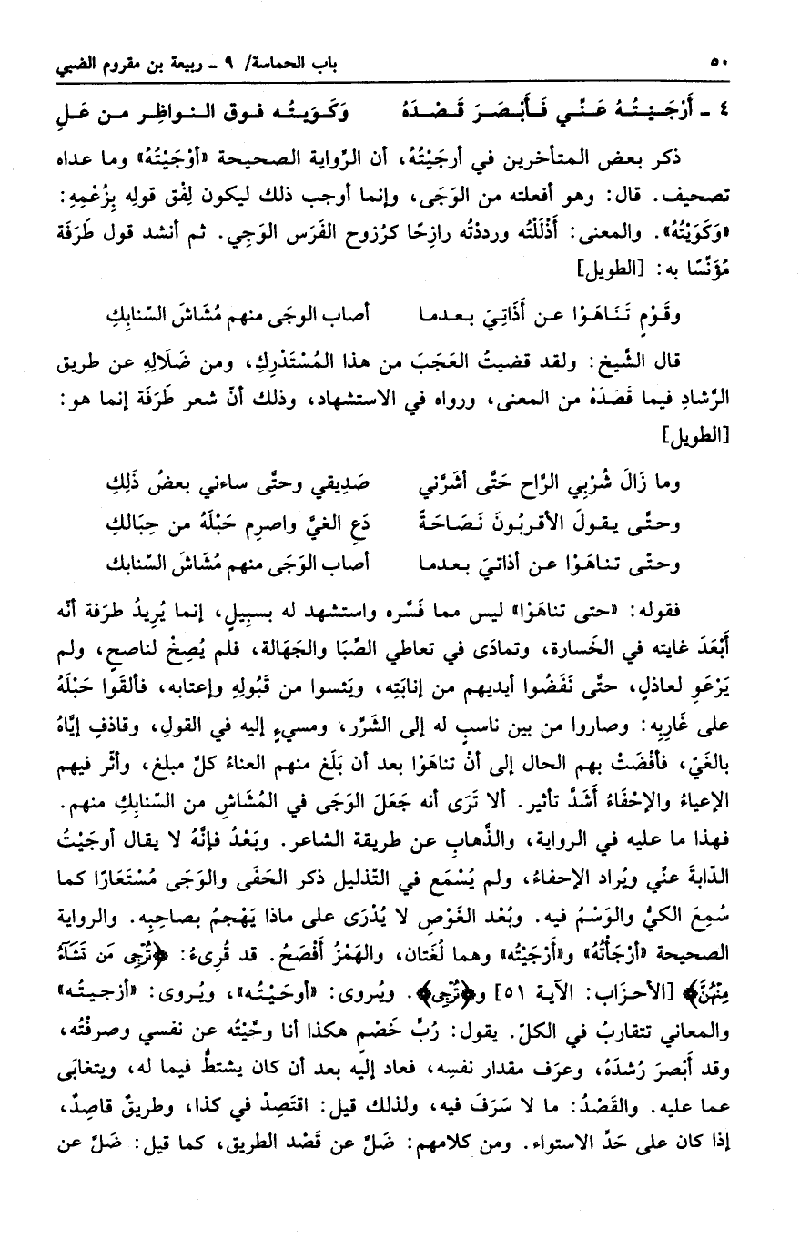 فقوله: " حتى تناهوا " ليس مما فسره واستشهد له بسبيل، إنما يريد طرفة أنه أبعد غايته في الخسارة، وتمادى في تعاطي الصبا والجهالة، فلم يصخ لناصحٍ، ولم يرعو لعاذلٍ، حتى نفضوا أيديهم من إنابته، ويئسوا من قبوله وإعتابه، فألقوا حبله على غاربه: وصاروا من بين ناسبٍ له إلى الشر، ومسيءٍ إليه في القول، وقاذفٍ إياه بالغي، فأفضت بهم الحال إلى أن تناهوا بعد أن بلغ منهم العناء كل مبلغ، وأثر فيهم الإعياء والإخفاء أشد تأثير. ألا ترى أنه جعل الوجى في المشاش من السنابك منهم. فهذا ما عليه في الرواية، والذهاب عن طريقة الشاعر. وبعد فإنه لا يقال أوجيت الدابة عني ويراد الإخفاء، ولم يسمع في التذليل ذكر الحفى والوجى مستعاراً كما سمع الكي والوسم فيه. وبعد الغوص لا يدري على ماذا يهجم بصاحبه. والرواية الصحيحة " أرجأته " و " أرجيته " وهما لغتان، والهمز أفصح. قد قرى: " ترجى من تشاء منهن " و " ترجى ". ويروى: " أوحيته "، ويروى: " أزجيته " والمعاني تتقارب في الكل. يقول: رب خصمٍ هكذا أنا وحيته عن نفسي وصرفته، وقد أبصر رشده، وعرف مقدار نفسه، فعاد إليه بعد أن كان يشتط فيما له، ويتغابى عما عليه. والقصد: ما لا سرف فيه، ولذلك قيل اقتصد في كذا. وطريقٌ قاصدٌ إذا كان على حد الاستواء. ومن كلامهم: ضل عن قصد الطريق، كما قيل: ضل عن