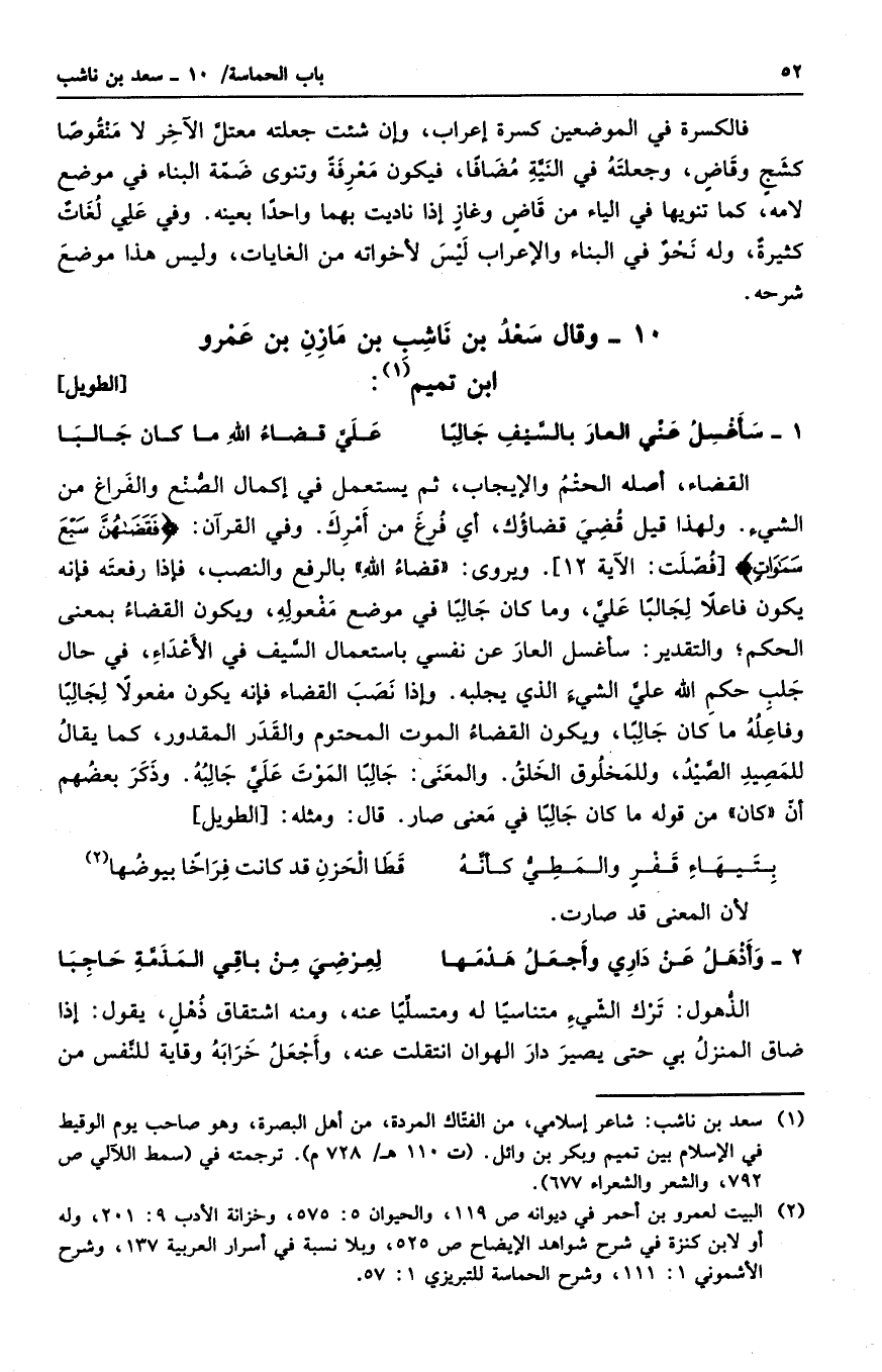 القضاء، أصله الحتم والإيجاب، ثم يستعمل في إكمال الصنع والفراغ من الشيء. ولهذا قيل قضي قضاؤك، أي فرغ من أمرك. وفي القرآن: " فقضاهن سبع سموات ". ويروى: " قضاء الله " بالرفع والنصب، فإذا رفعته فإنه يكون فاعلا لجالباً علي، وما كان جالباً في موضع مفعوله، ويكون القضاء بمعنى الحكم. والتقدير: سأغسل العار عن نفسي باستعمال السيف في الأعداء، في حال جلب حكم الله على الشيء الذي يجلبه. وإذا نصب القضاء فإنه يكون مفعولاً لجالباً وفاعله ما كان جالباً، ويكون القضاء الموت المحتوم والقدر المقدور، كما يقال للمصيد الصيد، وللمخلوق الخلق. والمعنى جالباً الموت على جالبه. وذكر بعضهم أن " كان " من قوله ما كان جالباً في معنى صار. قال: ومثله:
