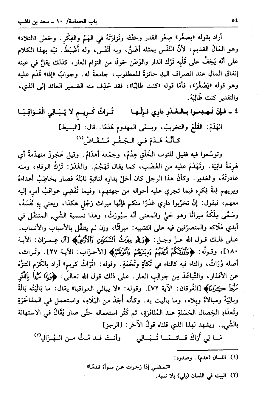 وتوسعوا فيه فقيل للثوب الخلق هدمٌ، وجمعه أهدامٌ. وقيل عجوزٌ متهدمةٌ أي هرمةٌ فانية. وتهدم عليه من الغضب، كما يقال تهجم. والغدر: ترك الوفاء، ومنه غادرته، والغدير. وكأن هذا الرجل كان أخل بداره لنائبةٍ نابته فصار يخاطب أعداءه ويريهم قلة فكره فيما تجري عليه أحواله من جهتهم، وفيما تفضي عواقب أمره إليه معهم، فيقول: إن تخربوا داري غدراً منكم فإنها ميراث رجلٍ هكذا، ويعني به نفسه، وسمي ملكه ميراثاً وهو حيٌ، والمعني أنه سيورث، وهذا تسمية الشيء المتنقل في أيدي ملاكه والمتصرفين فيه على التشبيه: ميراثاً، وإن لم يتنقل بالأسباب والأنساب. على ذلك قول الله عز وجل: " ولله ميراث السموات والأرض "، وقوله: " وأورثكم أرضهم وديارهم وأموالهم ". وتراث، أصله وراثٌ، والتاء فيه كالتاء في تكأةٍ وتخمةٍ. وقوله: " تراث كريمٍ " أراد بالكرم التنزه عن الأقذار، والتباعد من جوالب العار. على ذلك قول الله تعالى: " وإذا مروا باللغو مروا كراماً ". وقوله: " لايبالي العواقبا " يقال: ما باليته بالةً وباليةً ومبالاةً وبلاء، وما باليت به. وكأنه أخذ من البلاء، واستعمل في المفاخرة وتعداد الخصال الحسنة عند المنافرة، ثم كثر استعماله حتى صار يقال في الاستهانة بالشيء. ويشهد لهذا الذي قلناه قول الآخر: