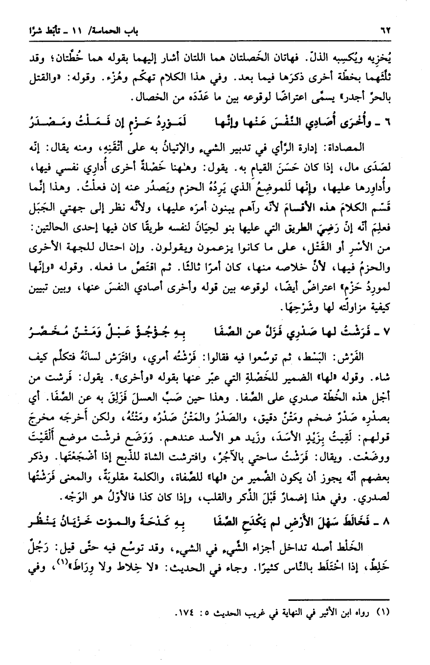 المصاداة: إدارة الرأي في تدبير الشيء والإتيان به على أتقنه، ومنه يقال: إنه لصدى مال، إذا كان حسن القيام به. يقول: وها هنا خصلة أخرى أداري نفسي فيها، وأداورها عليها، وإنها للموضع الذي يرده الحزم ويصدر عنه إن فعلت. وهذا إنما قسم الكلام هذه الأقسام لأنه رآهم يبنون أمره عليها، ولأنه نظر إلى جهتي الجبل فعلم أنه إن رضي الطريق التي عليها بنو لحيان لنفسه طريقاً كان فيها إحدى الحالتين: من الأسر أو القتل، على ما كانوا يزعمون ويقولون. وإن احتال للجهة الأخرى والحزم فيها، لأن خلاصه منها، كان أمراً ثالثاً. ثم اقتص ما فعله. وقوله وإنها لمورد حزم اعتراض أيضاً، لوقوعه بين قوله وأخرى أصادى النفس عنها، وبين تبيين كيفية مزاولته لها وشرحها.