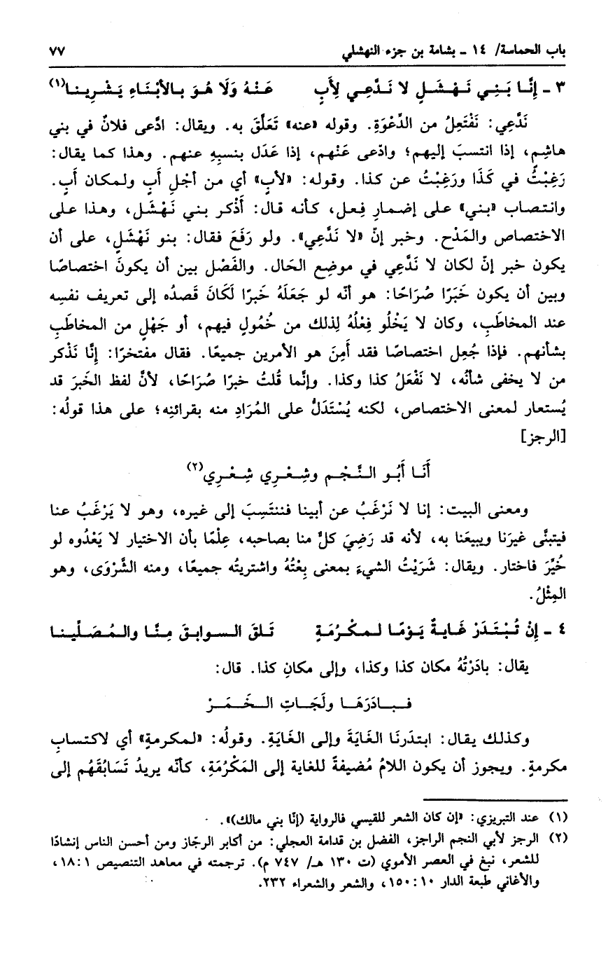 ندعي: نفتعل من الدعوة. وقوله " عنه " تعلق به. ويقال ادعى فلانٌ في بني هاشمٍ، إذا انتسب إليهم؛ وادعى عنهم، إذا عدل بنسبه عنهم. وهذا كما يقال: رغبت في كذا ورغبت عن كذا. وقوله: " لأبٍ " أي من أجل أبٍ ولمكان أبٍ. وانتصاب " بني " على إضمار فعل، كأنه قال: أذكر بني نهشل. وهذا على الاختصاص والمدح. وخبر إن " لا ندعي ". ولو رفع فقال: بنو نهشلٍ، على أن يكون خبر إن لكان لا ندعي في موضع الحال. والفصل بين أن يكون اختصاصاً وبين أن يكون خبراً صراحاً: هو أنه لو جعله خبراً لكان قصده إلى تعريف نفسه عند المخاطب، وكان لا يخلو فعله لذلك من خمولٍ فيهم، أو جهلٍ من المخاطب بشأنهم. فإذا جعل اختصاصاً فقد أمن هو الأمرين جميعاً. فقال مفتخراً: إنا نذكر من لا يخفى شأنه، لا نفعل كذا وكذا. وإنما قلت خبراً صراحاً، لأن لفظ الخبر قد يستعار لمعنى الاختصاص، لكنه يستدل على المراد منه بقرائنه؛ على هذا قوله:
