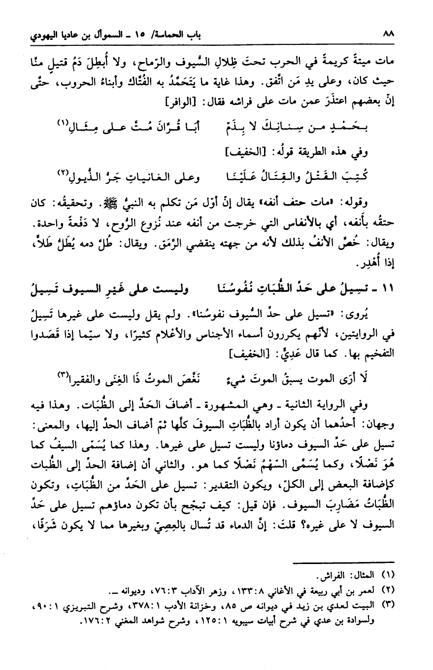 وفي الرواية الثانية - وهي المشهورة - أضاف الحد إلى الظبات. وهذا فيه وجهان: أحدهما أن يكون أراد بالظبات السيوف كلها ثم أضاف الحد إليها، والمعنى: تسيل على حد السيوف دماؤنا وليست تسيل على غيرها. وهذا كما يسمى السيف كما هو نصلاً، وكما يسمى السهم نصلاً كما هو. والثاني أن إضافة الحد إلى الظبات كإضافة البعض إلى الكل، ويكون التقدير: تسيل على الحد من الظبات، وتكون الظبات مضارب السيوف. فإن قيل: كيف تبجح بأن تكون دماؤهم تسيل على حد السيوف لا على غيره؟ قلت: إن الدماء قد تسال بالعصي وبغيرها مما لا يكون شرفاً،