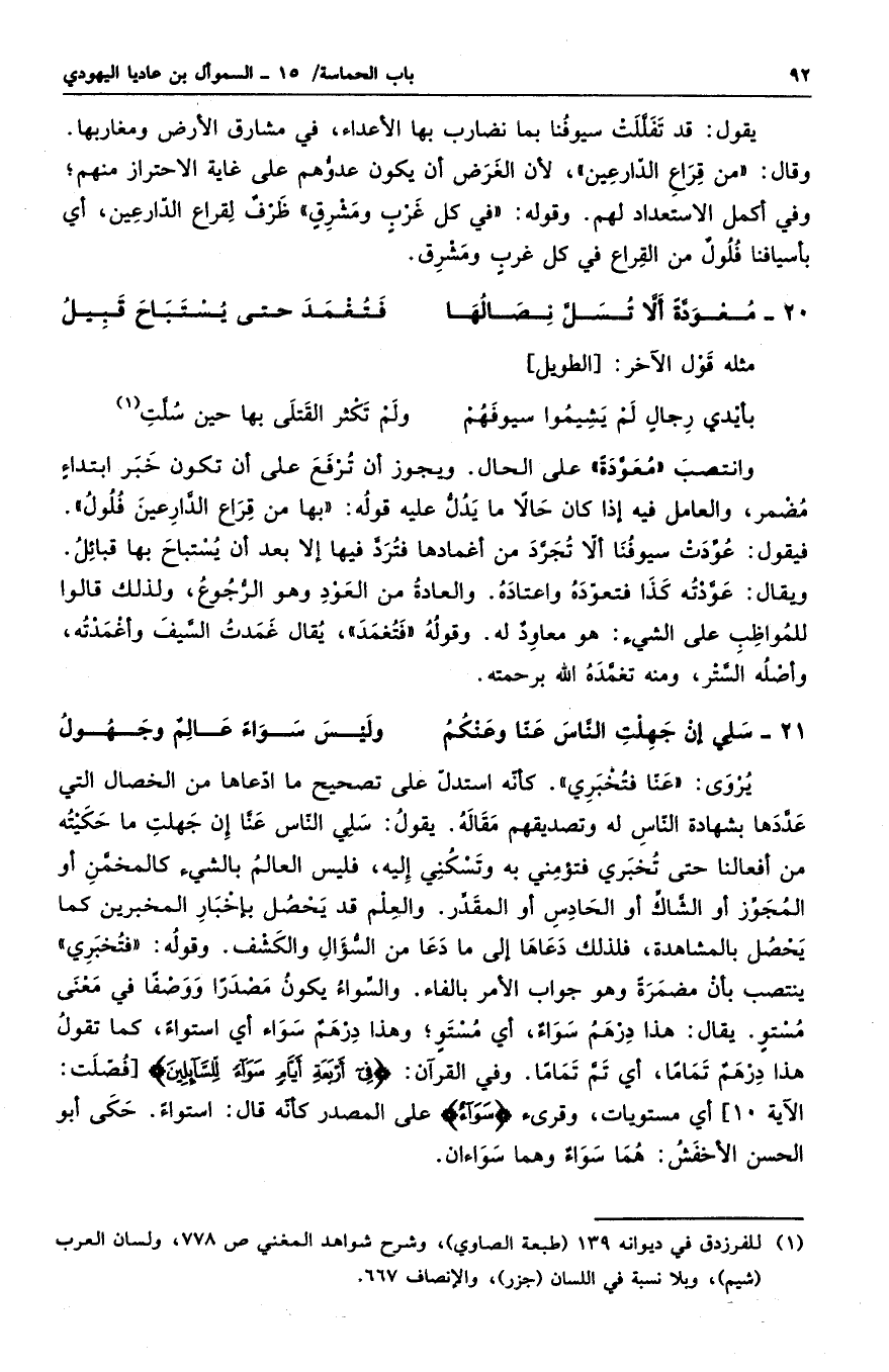 يروى: عنا فتخبري. كأنه استدل على تصحيح ما ادعاها من الخصال التي عددها بشهادة الناس له وتصديقهم مقاله. يقول: سلي الناس عنا إن جهلت ما حكيته من أفعالنا حتى تخبري فتؤمني به وتسكني إليه، فليس العالم بالشيء كالمخمن أو المجوز أو الشاك أو الحادس أو المقدر. والعلم قد يحصل بإخبار المخبرين كما يحصل بالمشاهدة، فلذلك دعاها إلى ما دعا من السؤال والكشف. وقوله: فتخبري ينتصب بأن مضمرة وهو جواب الأمر بالفاء. والسواء يكون مصدراً ووصفاً في معنى مستوٍ. يقال: هذا درهمٌ سواءٌ، أي مستوٍ؛ وهذا درهمٌ واء أي استواءً، كما تقول هذا درهمٌ تماماً، أي تم تماماً. وفي القرآن: " في أربعة أيامٍٍ سواءٍ للسائلين " أي مستويات، وقرى " سواءً " على المصدر كأنه قال: استواءً. حكى أبو الحسن الأخفش: هما سواءٌ وهما سواءان.