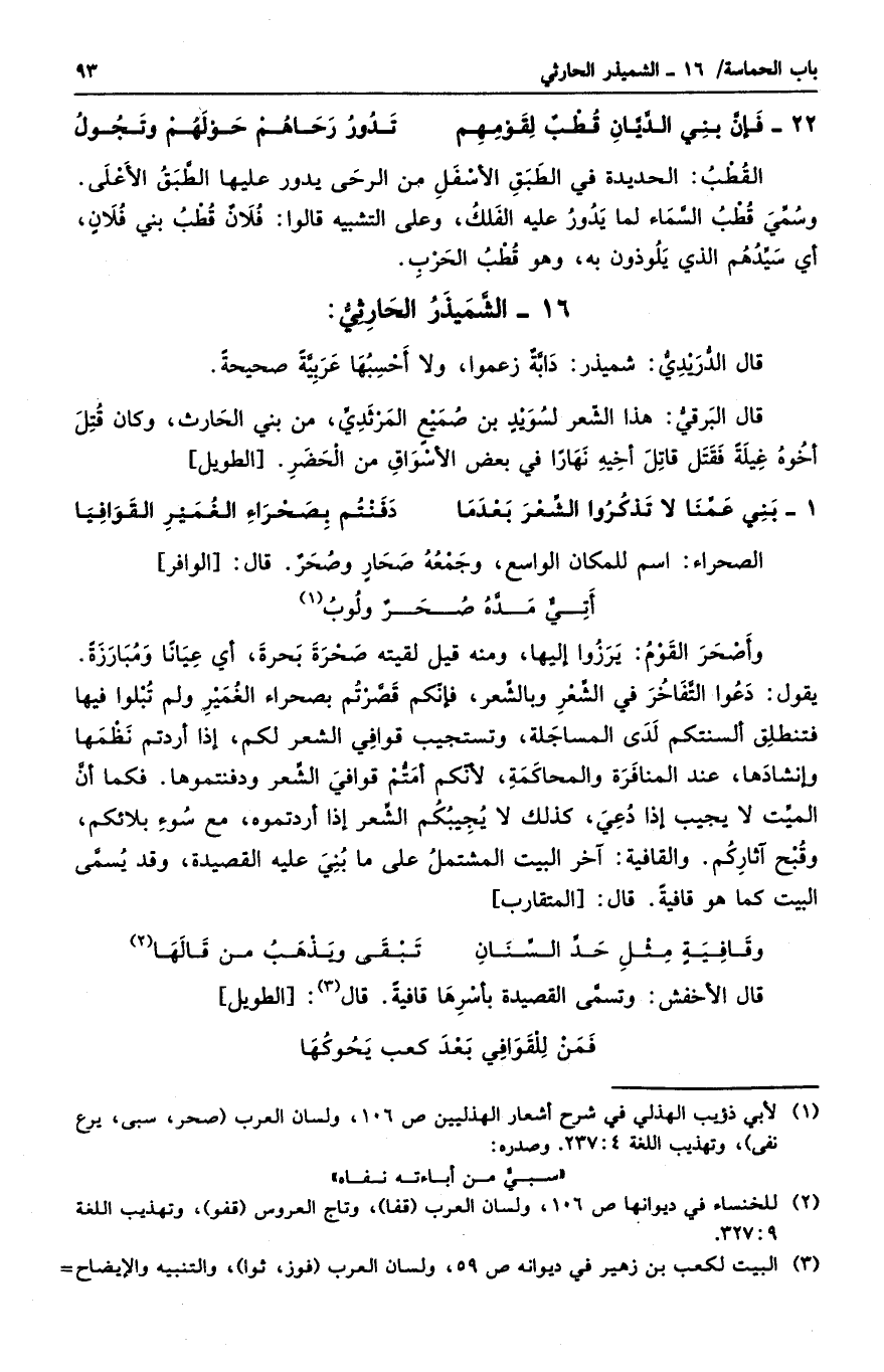 وأصحر القوم: برزوا إليها، ومنه قيل لقيته صحرة بحرة، أي عياناً ومبارزةً. يقول: دعوا التفاخر في الشعر وبالشعر، فإنكم قصرتم بصحراء الغمير ولم تبلوا فيها فتنطلق ألسنتكم لدى المساجلة، وتستجيب قوافي الشعر لكم، إذا أردتم نظمها وإنشادها، عند المنافرة والمحاكمة، لأنكم أمتم قوافي الشعر ودفنتموها. فكما أن الميت لا يجيب إذا دعي، كذلك لا يجيبكم الشعر إذا أردتموه، مع سوء بلائكم، وقبح آثاركم. والقافية: آخر البيت المشتمل على ما بني عليه القصيدة. وقد يسمى البيت كما هو قافيةً. قال: