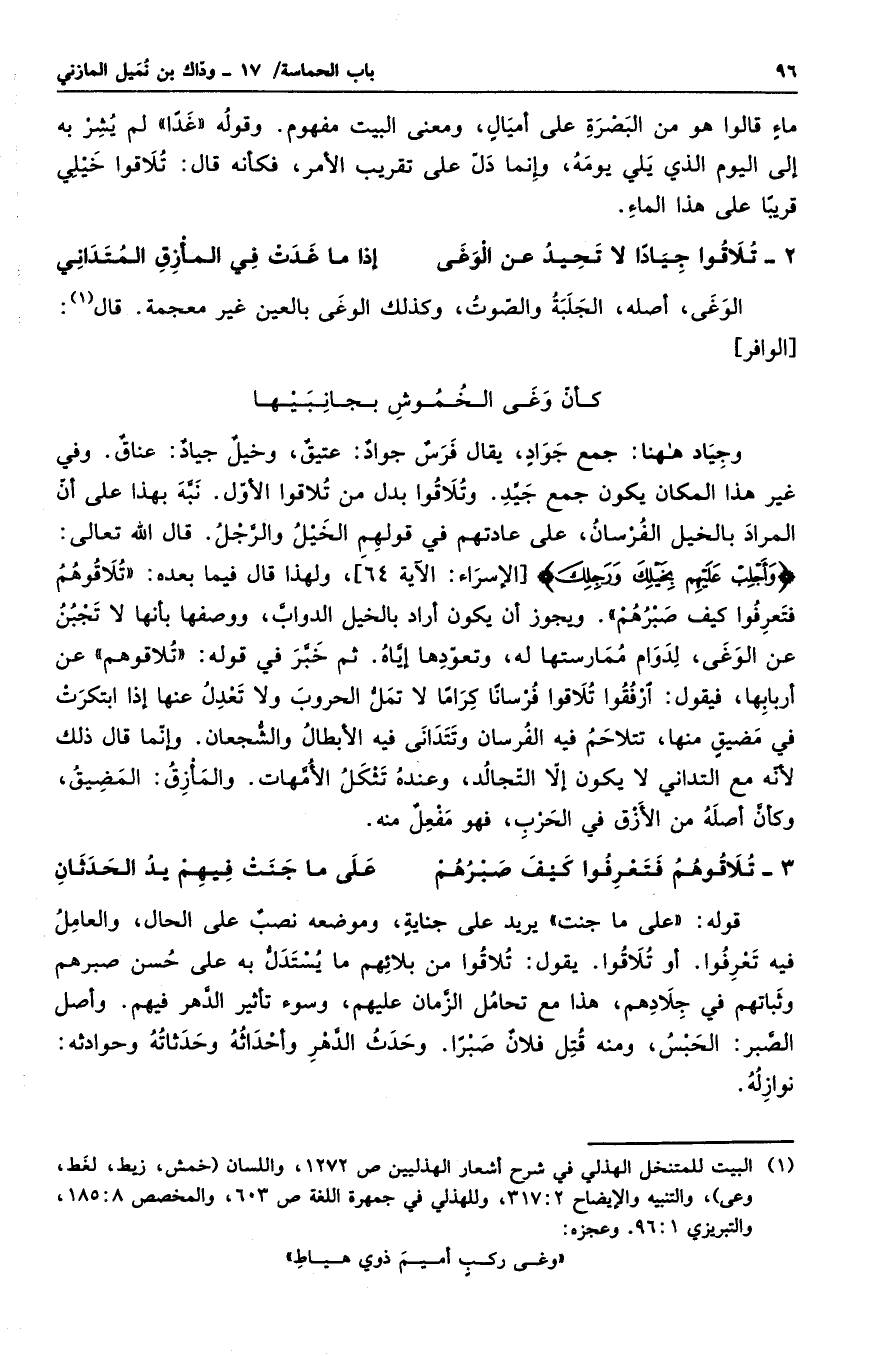 وجياد ها هنا: جمع جوادٍ، يقال فرسٌ جواد: عتيقٌ، وخيلٌ جيادٌ: عتاقٌ. وفي غير هذا المكان يكون جمع جيد. وتلاقوا بدل من تلاقوا الأول. نبه بهذا على أن المراد بالخيل الفرسان، على عادتهم في قولهم الخيل والرجل. قال الله تعالى: " وأجلب عليهم بخيلك ورجلك "، ولهذا قال فيما بعده: تلاقوهم فتعرفوا كيف صبرهم. ويجوز أن يكون أراد بالخيل الدواب، ووصفها بأنها لا تجبن عن الوغى، لدوام ممارستها له، وتعودها إياه. ثم خبر في قوله: تلاقوهم عن أربابها، فيقول: ارفقوا تلاقوا فرساناً كراماً لا تمل الحروب ولا تعدل عنها إذا ابتكرت في مضيقٍ منها، تتلاحم فيه الفرسان وتتدانى فيه الأبطال والشجعان. وإنما قال ذلك لأنه مع التداني لا يكون إلا التجالد، وعنده تثكل الأمهات. والمأزق: المضيق، وكان أصله من الأزق في الحرب، فهو مفعلٌ منه.