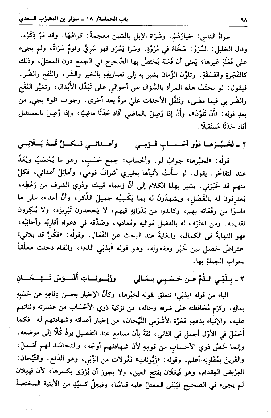 قوله: لخبرها جواب لو. وأحساب: جمع حسبٍ، وهو ما يحسب ويعد عند التفاخر. لو سألت لأنبأها بخبري أشراف قومي، وأماثل أعدائي، فكلٌ منهم قد خبرني. يشير بهذا الكلام إلى أن زعماء قبيلته وذوي الشرف من رهطه، يعترفون له بالفضل، ويشهدون له بما يكسبه جميل الذكر، وأن أعداءه على ما قاسوه من وقعاته بهم، وكابدوا من بدراته فيهم، لا يجحدون تبريزه، ولا ينكرون تقديمه. ومن اعترف له بالفضل مواليه ومعاديه، وصدقه في دعواه أقاربه وأجانبه، فهو النهاية في الكمال، والغاية عند البحث عن الفعال. وقوله: فكلٌ قد بلاني اعتراضٌ حصل بين خبر ومفعوله، وهو قوله بذبي الذم والفاء دخلت معلقةً لجواب الجملة بها.