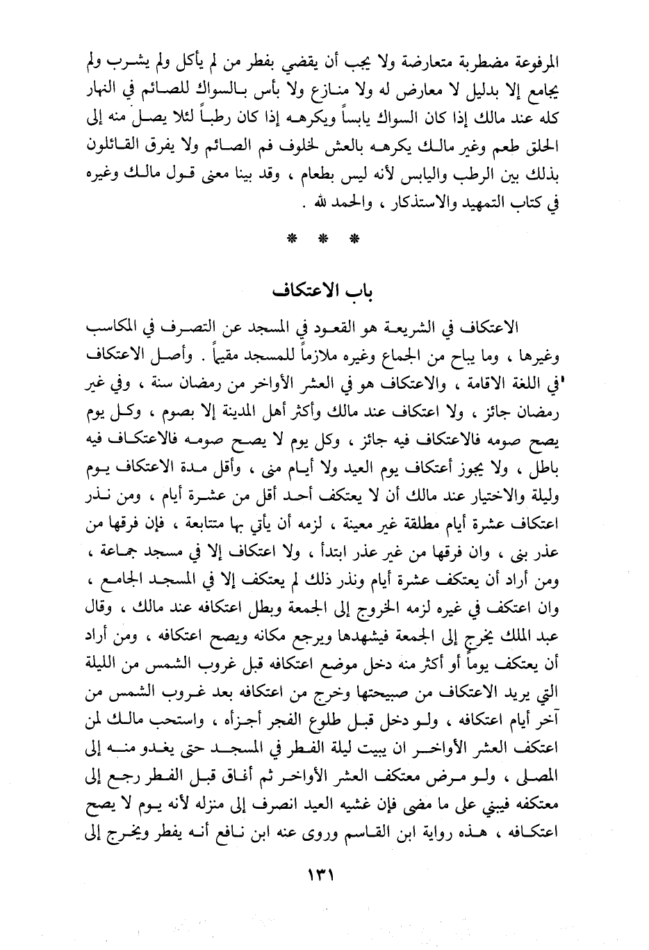 المرفوعة مضطربة متعارضة ولا تجب أن يقضي بفطر من لم يأكل ولم يشرب ولم يجامع إلا بدليل لا معارض له ولا منازع ولا بأس بالسواك للصائم في النهار كله عند مالك إذا كان السواك يابسا ويكرهه إذا كان رطبا لئلا يصل منه إلى الحلق طعم وغير مالك يكرهه بالعش لخلوف فم الصائم ولا يفرق القائلون بذلك بين الرطب واليابس لأنه ليس بطعام وقد بينا معنى قول مالك وغيره في كتاب التمهيد والاستذكار والحمد لله باب الاعتكاف الاعتكاف في الشريعة هو القعود في المسجد عن التصرف في المكاسب وغيرها وما يباح من الجماع وغيره ملازما للمسجد مقيما وأصل الاعتكاف في اللغة الاقامة والاعتكاف هو في العشر الأواخر من رمضان سنة وفي غير رمضان جائز ولا اعتكاف عند مالك وأكثر أهل المدينة إلا بصوم وكل يوم يصح صومه فالاعتكاف فيه جائز وكل يوم لا يصح صومه فالاعتكاف فيه باطل ولا يجوز أعتكاف يوم العيد ولا أيام منى وأقل مدة الاعتكاف يوم وليلة والاختيار عند مالك أن لا يعتكف أحد أقل من عشرة أيام ومن نذر اعتكاف عشرة أيام مطلقة غير معينة لزمه أن يأتي بها متتابعة فإن فرقها من عذر بنى وان فرقها من غير عذر ابتدأ ولا اعتكاف إلا في مسجد جماعة ومن أراد أن يعتكف عشرة أيام ونذر ذلك لم يعتكف إلا في المسجد الجامع وان اعتكف في غيره لزمه الخروج إلى الجمعة وبطل اعتكافه عند مالك وقال عبد الملك يخرج إلى الجمعة فيشهدها ويرجع مكانه ويصح اعتكافه ومن أراد أن يعتكف يوما أو أكثر منه دخل موضع اعتكافه قبل غروب الشمس من الليلة التي يريد الاعتكاف من صبيحتها وخرج من اعتكافه بعد غروب الشمس من آخر أيام اعتكافه ولو دخل قبل طلوع الفجر أجزأه واستحب مالك لمن اعتكف العشر الأواخر ان يبيت ليلة الفطر في المسجد حتى يغدو منه إلى المصلى ولو مرض معتكف العشر الأواخر ثم أفاق قبل الفطر رجع إلى معتكفه فيبنى على ما مضى فإن غشيه العيد انصرف إلى منزله لأنه يوم لا يصح اعتكافه هذه رواية ابن القاسم وروى عنه ابن نافع أنه يفطر ويخرج إلى