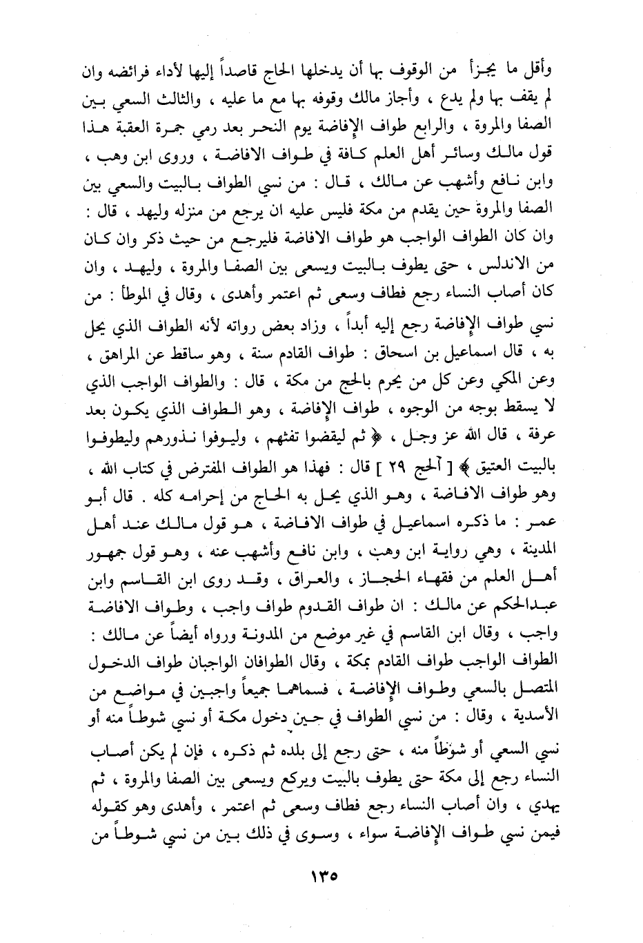 وأقل ما يجزأ من الوقوف بها أن يدخلها الحاج قاصدا إليها لأداء فرائضه وان لم يقف بها ولم يدع وأجاز مالك وقوفه بها مع ما عليه والثالث السعي بين الصفا والمروة والرابع طواف الإفاضة يوم النحر بعد رمي جمرة العقبة هذا قول مالك وسائر أهل العلم كافة في طواف الافاضة وروى ابن وهب وابن نافع وأشهب عن مالك قال من نسي الطواف بالبيت والسعي بين الصفا والمروة حين يقدم من مكة فليس عليه ان يرجع من منزله وليهد قال وإن كان الطواف الواجب هو طواف الافاضة فليرجع من حيث ذكر وان كان من الاندلس حتى يطوف بالبيت ويسعى بين الصفا والمروة وليهد وان كان أصاب النساء رجع فطاف وسعى ثم اعتمر وأهدى وقال في الموطأ من نسي طواف الإفاضة رجع إليه أبدا وزاد بعض رواته لأنه الطواف الذي يحل به قال اسماعيل بن اسحاق طواف القادم سنة وهو ساقط عن المراهق وعن المكي وعن كل من يحرم بالحج من مكة قال والطواف الواجب الذي لا يسقط بوجه من الوجوه طواف الإفاضة وهو الطواف الذي يكون بعد عرفة قال الله عز وجل ثم ليقضوا تفثهم وليوفوا نذروهم وليطوفوا بالبيت العتيق الحج قال فهذا هو الطواف المفترض في كتاب الله وهو طواف الافاضة وهو الذي يحل به الحاج من إحرامه كله قال أبو عمر ما ذكره اسماعيل في طواف الافاضة هو قول مالك عند أهل المدينة وهي رواية ابن وهب وابن نافع وأشهب عنه وهو قول جمهور أهل العلم من فقهاء الحجاز والعراق وقد روى ابن القاسم وابن عبد الحكم عن مالك ان طواف القدوم طواف واجب وطواف الافاضة واجب وقال ابن القاسم في غير موضع من المدونة ورواه أيضا عن مالك الطواف الواجب طواف القادم بمكة وقال الطوافان الواجبان طواف الدخول المتصل بالسعي وطواف الإفاضة فسماهما جميعا واجبين في مواضع من الأسدية وقال من نسي الطواف في حين دخول مكة أو نسي شوطا منه أو نسي السعي أو شوطا منه حتى رجع إلى بلده ثم ذكره فإن يكن أصاب النساء رجع إلى مكة حتى يطوف بالبيت ويركع ويسعى بين الصفا والمروة ثم يهدي وان أصاب النساء رجع فطاف وسعى ثم اعتمر وأهدى وهو كقوله فيمن نسي طواف الإفاضة سواء وسوى في ذلك بين من نسي شوطا من