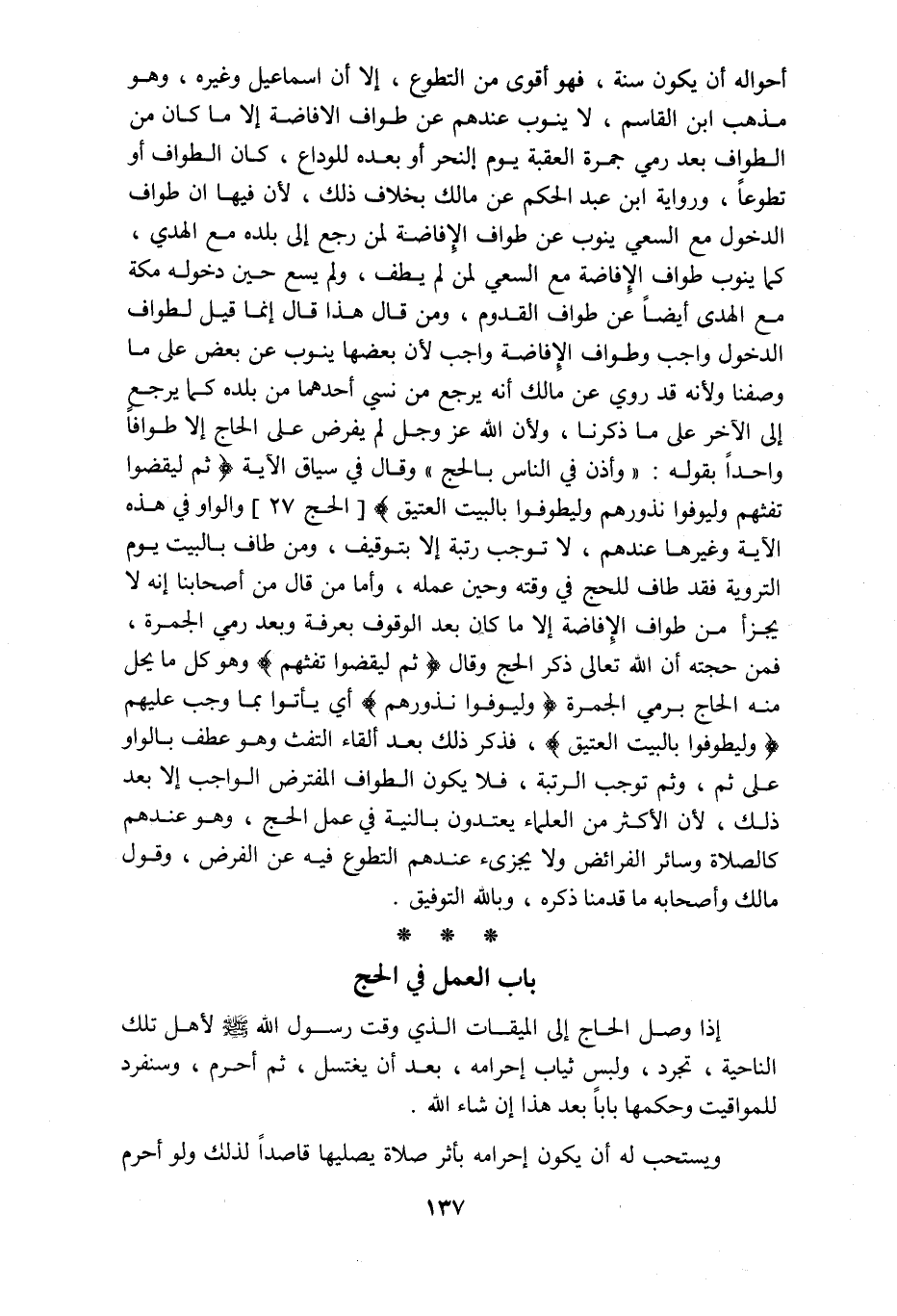 أحواله أن يكون سنة فهو أقوى من التطوع إلا أن اسماعيل وغيره وهو مذهب ابن القاسم لا ينوب عندهم عن طواف الافاضة إلا ما كان من الطواف بعد رمي جمرة العقبة يوم النحر أو بعده للوداع كان الطواف أو تطوعا ورواية ابن عبد الحكم عن مالك بخلاف ذلك لأن فيها ان طواف الدخول مع السعي ينوب عن طواف الإفاضة لمن رجع إلى بلده مع الهدي كما ينوب طواف الإفاضة مع السعي لمن لم يطف ولم يسع حين دخوله مكة مع الهدى أيضا عن طواف القدوم ومن قال هذا قال إنما قيل لطواف الدخول واجب وطواف الإفاضة واجب لأن بعضها ينوب عن بعض على ما وصفنا ولأنه قد روي عن مالك أنه يرجع من نسي أحدهما من بلده كما يرجع إلى الآخر على ما ذكرنا ولأن الله عز وجل لم يفرض على الحاج إلا طوافا واحدا بقوله وأذن في الناس بالحج وقال في سياق الآية ثم ليقضوا تفثهم وليوفوا نذورهم وليطوفوا بالبيت العتيق الحج والواو في هذه الآية وغيرها عندهم لا توجب رتبة إلا بتوقيف ومن طاف بالبيت يوم التروية فقد طاف للحج في وقته وحين عمله وأما من قال من أصحابنا إنه لا يجزأ من طواف الإفاضة إلا ما كان بعد الوقوف بعرفة وبعد رمي الجمرة فمن حجته أن الله تعالى ذكر الحج وقالثم ليقضوا تفثهم وهو كل ما يحل منه الحاج برمي الجمرة وليوفوا نذرورهم أي يأتوا بما وجب عليهم وليطوفوا بالبيت العتيق فذكر ذلك بعد إلقاء التفث وهو عطف بالواو على ثم وثم توجب الرتبة فلا يكون الطواف المفترض الواجب إلا بعد ذلك لأن الأكثر من العلماء يعتدون بالنية في عمل الحج وهو عندهم كالصلاة وسائر الفرائض ولا يجزئ عندهم التطوع فيه عن الفرض وقول مالك وأصحابه ما قدمنا ذكره وبالله التوفيق باب العمل في الحج إذا وصل الحاج إلى الميقات الذي وقت رسول الله صلى الله عليه وسلم لأهل تلك الناحية تجرد ولبس ثياب إحرامه بعد أن يغتسل ثم أحرم وسنفرد للمواقيت وحكمها بابا بعد هذا إن شاء الله ويستحب له أن يكون إحرامه بأثر صلاة يصليها قاصدا لذلك ولو أحرم