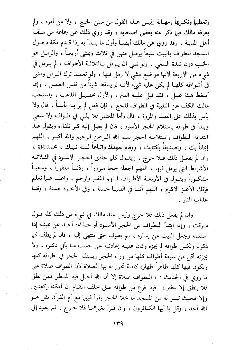 وتعظيما وتكريما ومهابة وليس هذا القول من سنن الحج ولا من أمره ولم يعرفه مالك فيما ذكر عنه بعض اصحابه وقد روى ذلك عن جماعة من سلف أهل المدينة وقد روي عن مالك أيضا وأول ما يبدأ به إذا قدم مكة دخول المسجد للطواف بالبيت سبعا يرمل منهن في ثلاث ويمشي أربعا والرمل هو الخبب دون شدة السعي ولو نسي ان يرمل بالثلاثة الأطواف لم يرمل في شئ من الأربعة لأنها مواضع مشي لا رمل فيها ولو تعمد ترك الرمل ومشى في أشواطه كلها لم يكن عليه شئ لأنه لم يسقط شيئا من نفس العمل وإنما أسقط هيئة عمل فقد قيل عليه الدم والأول تحصيل المذهب واستحب مالك الكف عن التلبية في الطواف للحج فإن فعل لم ير به بأسا قال ولا بأس بذلك على الصفا والمروة قال وأما المعتمر فلا يلبي في طواف ولا سعي ويبدأ في طوافه باستلام الحجر الأسود فان لم يصل إليه كبر تلقاءه ويقول عند ابتدائه الطواف واستلامه الحجر بسم الله الرحمن الرحيم والله أكبر اللهم إيمانا بك وتصديقا بكتابك ووفاء بعهدك واتباعا لسنة نبيك محمد صلى الله عليه وسلم وان لم يفعل ذلك فلا حرج ويقول كلما حاذى الحجر الأسود في الثلاثة الأشواط التي يرمل فيها اللهم اجعله حجا مبرورا وذنبا مغفورا وسعيا مشكورا ويقول في الأربعة الأطراف اللهم اغفر وارحم واعف عما تعلم فإنك الأعز الأكرم اللهم آتنا في الدنيا حسنة وفي الآخرة حسنة وقنا عذاب النار وان لم يفعل فلا حرج وليس عند مالك في شئ من ذلك كله قول موقت وإذا ابتدأ الطواف من الحجر الأسود أو حذاءه أخذ عن يمينه إذا استلمه وجعل البيت عن يساره ثم يطوف حتى ينتهي إليه فان لم يطف كما ذكرنا ونكس طوافه لم يجزه وكان عليه إعادته على حسب ما يأتي ذكره ولا يجزئه أقل من سبعة أطواف كلها من وراء الحجر ويستلم الحجر في أطوافه كلها ويكون فيها كلها طاهرا طهارة كاملة تجوز له بها الصلاة لأن الطواف صلاة على ما روي في الحديث الطواف صلاة إلا أن الله أحل فيه المنطق فيمن نطق فلا ينطق إلا بخير فإذا فرغ من طوافه صلى خلف القام إن أمكنه ركعتين وإلا فحيث تيسر له من المسجد ما خلا الحجر يقرأ فيهما مع أم القرآن بقل هو الله أحد وقل يا أيها الكافرون وان قرأ بغيرهما فلا حرج ثم يعود إلى