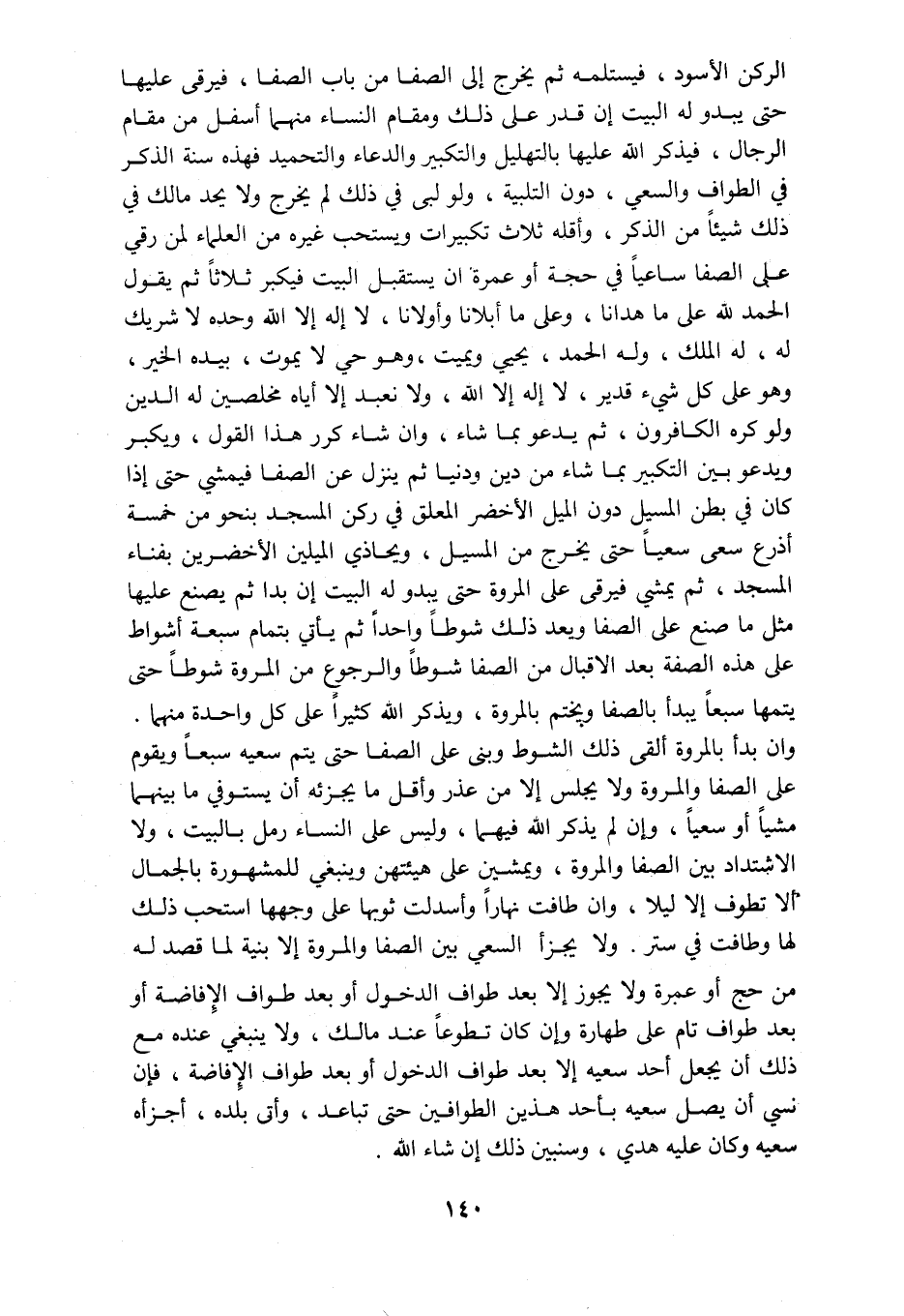 الركن الأسود فيستلمه ثم يخرج إلى الصفا من باب الصفا فيرقى عليها حتى يبدو له البيت إن قدر على ذلك ومقام النساء منهما أسفل من مقام الرجال فيذكر الله عليها بالتهليل والتكبير والدعاء والتحميد فهذه سنة الذكر في الطواف والسعي دون التلبية ولو لبى في ذلك لم يخرج ولا يحد مالك في ذلك شيئا من الذكر وأقله ثلاث تكبيرات ويستحب غيره من العلماء لمن رقي على الصفا ساعيا في حجة أو عمرة ان يستقبل البيت فيكبر ثلاثا ثم يقول الحمد لله على ما هدانا وعلى ما أبلانا وأولانا لا إله إلا الله وحده لا شريك له له الملك وله الحمد يحيي ويميت وهو حي لا يموت بيده الخير وهو على كل شئ قدير لا إله إلا الله ولا نعبد إلا إياه مخلصين له الدين ولو كره الكافرون ثم يدعو بما شاء وان شاء كرر هذا القول ويكبر ويدعو بين التكبير بما شاء من دين ودنيا ثم ينزل عن الصفا فيمشي حتى إذا كان في بطن المسيل دون الميل الأخضر المعلق في ركن المسجد بنحو من خمسة أذرع سعى سعيا حتى يخرج من المسيل ويحاذي الميلين الأخضرين بفناء المسجد ثم يمشي فيرقى على المروة حتى يبدو له البيت إن بدا ثم يصنع عليها مثل ما صنع على الصفا ويعد ذلك شوطا واحدا ثم يأتي بتمام سبعة أشواط على هذه الصفة بعد الاقبال من الصفا شوطا والرجوع من المروة شوطا حتى يتمها سبعا يبدأ بالصفا ويختم بالمروة ويذكر الله كثيرا على كل واحدة منهما وان بدأ بالمروة ألقى ذلك الشوط وبنى على الصفا حتى يتم سعيه سبعا ويعوم على الصفا والمروة ولا يجلس إلا من عذر وأقل ما يجزأئه أن يستوفي ما بينهما مشيا أو سعيا وإن لم يذكر الله فيهما وليس على النساء رمل بالبيت ولا الاشتداد بين الصفا والمروة ويمشين على هيئتهن وينبغي للمشهورة بالجمال ألا تطوف إلا ليلا وان طافت نهارا وأسدلت ثوبها على وجهها استحب ذلك لها وطافت في ستر ولا يجزأ السعي بين الصفا والمروة إلا بنية لما قصد له من حج أو عمره ولا يجوز إلا بعد طواف الدخول أو بعد طواف الإفاضة أو بعد طواف تام على طهارة وإن كان تطوعا عند مالك ولا ينبغي عنده مع ذلك أن يجعل أحد سعيه إلا بعد طواف الدخول أو بعد طواف الإفاضة فإن نسي أن يصل سعيه بأحد هذين الطوافين حتى تباعد وأتى بلده أجزأه سعيه وكان عليه هدي وسنبين ذلك إن شاء الله