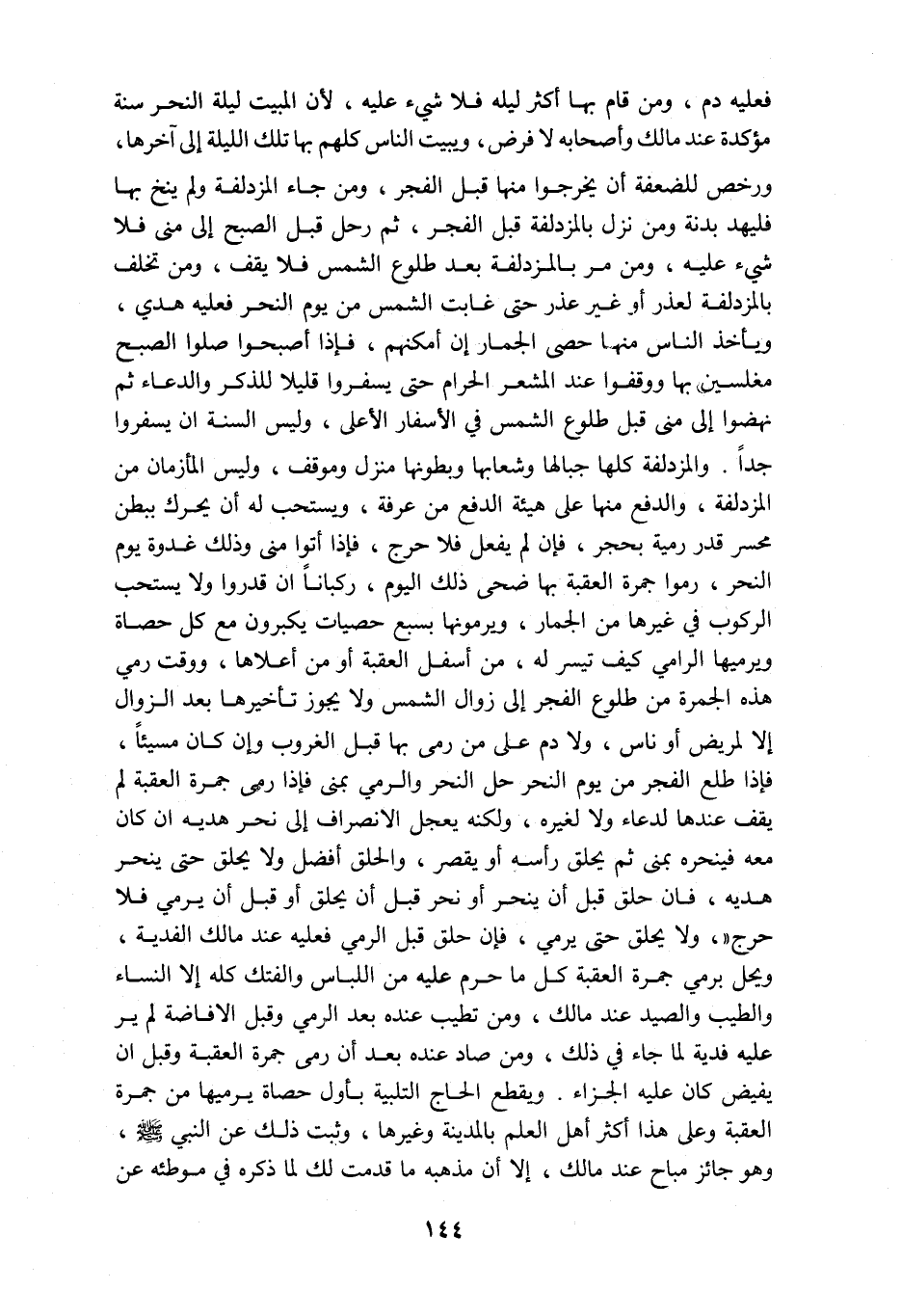 فعليه دم ومن قام بها أكثر ليله فلا شيء عليه لأن المبيت ليلة النحر سنة مؤكدة عند مالك وأصحابه لا فرض ويبيت الناس كلهم بها تلك الليلة إلى آخرها ورخص للضعفة أن يخرجوا منها قبل الفجر ومن جاء المزدلفة ولم ينخ بها فليهد بدنة ومن نزل بالمزدلفة قبل الفجر ثم رحل قبل الصبح إلى منى فلا شيء عليه ومن مر بالمزدلفة بعد طلوع الشمس فلا يقف ومن تخلف بالمزدلفة لعذر أو غير عذر حتى غابت الشمس من يوم النحر فعليه هدي ويأخذ الناس منها حصى الجمار إن أمكنهم فإذا أصبحوا صلوا الصبح مغلسين بها ووقفوا عند المشعر الحرام حتى يسفروا قليلا للذكر والدعاء ثم نهضوا إلى منى قبل طلوع الشمس في الأسفار الأعلى وليس السنة ان يسفروا جدا والمزدلفة كلها جبالها وشعابها وبطونها منزل وموقف وليس المأزمان من المزدلفة والدفع منها على هيئة الدفع من عرفة ويستحب له أن يحرك ببطن محسر قدر رمية بحجر فإن لم يفعل فلا حرج فإذا أتوا منى وذلك غدوة يوم النحر رموا جمرة العقبة بها ضحى ذلك اليوم ركبانا ان قدروا ولا يستحب الركوب في غيرها من الجمار ويرمونها بسبع حصيات يكبرون مع كل حصاة ويرمها الرامي كيف تيسر له من أسفل العقبة أو من أعلاها ووقت رمي هذه الجمرة من طلوع الفجر إلى زوال الشمس ولا يجوز تأخيرها بعد الزوال إلا لمريض أو ناس ولا دم على من رمى بها قبل الغروب وإن كان مسيئا فإذا طلع الفجر من يوم النحر حل النحر والرمي بمنى فإذا رمى جمرة العقبة لم يقف عندها لدعاء ولا لغيره ولكنه يعجل الانصراف إلى نحر هديه ان كان معه فينحره بمنى ثم يحلق رأسه أو يقصر والحلق أفضل ولا يحلق حتى ينحر هديه فان حلق قبل أن ينحر أو نحر قبل أن يحلق أو قبل أن يرمي فلا حرج ولا يحلق حتى يرمي فإن حلق قبل الرمي فعليه عند مالك الفدية ويحل برمي جمرة العقبة كل ما حرم عليه من اللباس والفتك كله إلا النساء والطيب والصيد عند مالك ومن تطيب عنده بعد الرمي وقبل الافاضة لم ير عليه فدية لما جاءء في ذلك ومن صاد عنده بعد أن رمى جمرة العقبة وقبل ان يفيض كان عليه الجزاء ويقطع الحاج التلبيه بأول حصاة يرميها من جمرة العقبة وعلى هذا أكثر أهل العلم بالمدينة وغيرها وثبت ذلك عن النبي صلى الله عليه وسلم وهو جائز مباح عند مالك إلا أن مذهبه ما قدمت لك لما ذكره في موطئه عن