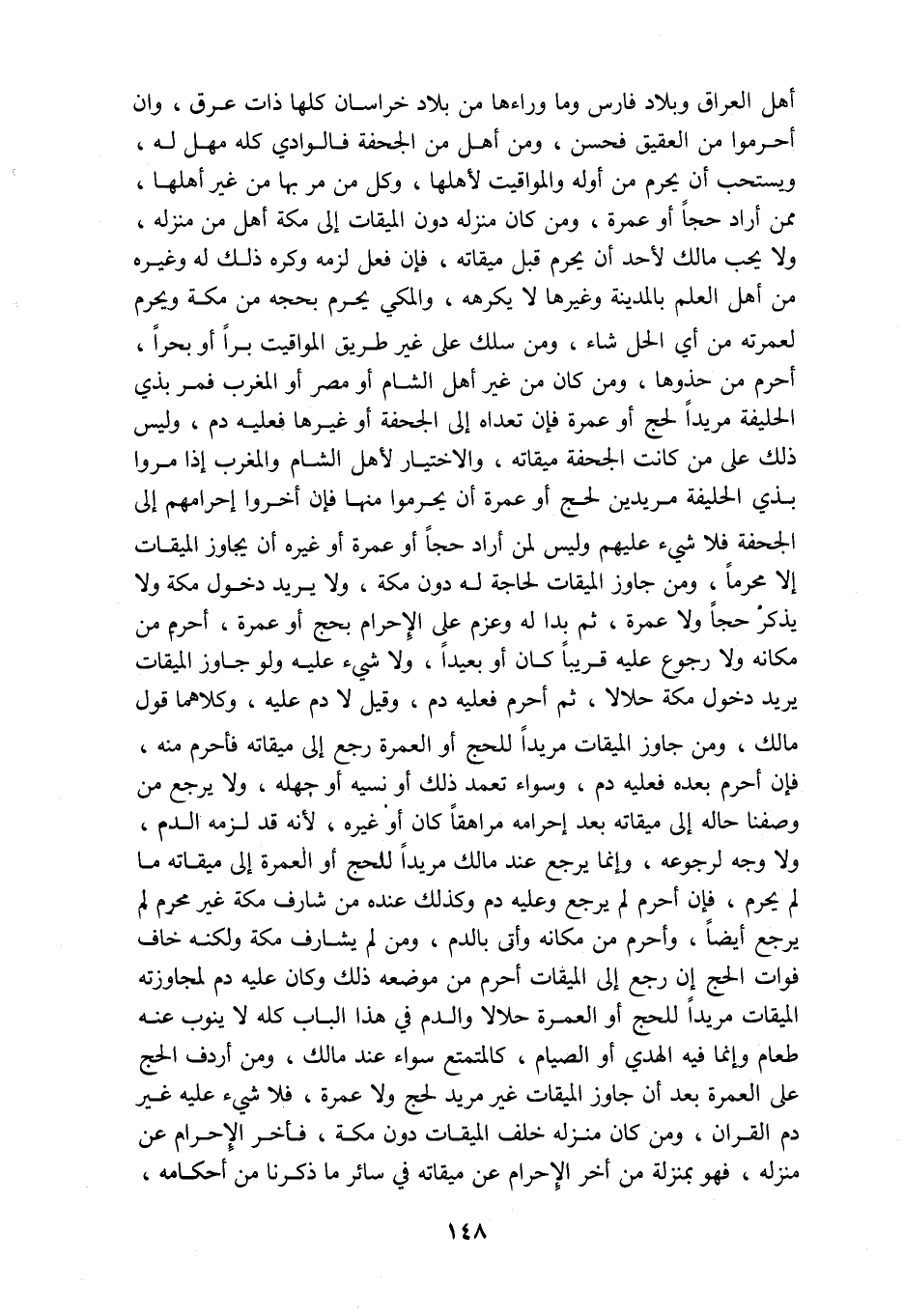 أهل العراق وبلاد فارس وما وراءها من بلاد خراسان كلها ذات عرق وان أحرموا من العقيق فحسن ومن أهل من الجحفة فالوادى كله مهل له ويستحب أن يحرم من أوله والمواقيت لأهلها وكل من مر بها من غير أهلها ممن أراد حجا أو عمرة ومن كان منزله دون الميقات إلى مكة أهل من منزله ولا يحب مالك لأحد أن يحرم قبل ميقاته فإن فعل لزمه وكره ذلك له وغيره من أهل العلم بالمدينة وغيرها لا يكرهه والمكي يحرم بحجه من مكة ويحرم لعمرته من أى الحل شاء ومن سلك على عير طريق المواقيت برا أو بحرا أحرم من حذوها ومن كان من غير أهل الشام أو مصر أو المغرب فمر بذي الحليفة مريدا لحج أو عمرة فإن تعداه إلى الجحفة أو غيرها فعليه دم وليس ذلك على من كانت الجحفة ميقاته والاختيار لأهل الشام والمغرب إذا مروا بذي الحليفة مريدين لحج أو عمرة أن يحرموا منها فإن أخروا إحرامهم إلى الجحفة فلا شئ عليهم وليس لمن أراد حجا أو عمرة أو غيره أن يجاوز الميقات إلا محرما ومن جاوز الميقات لحاجة له دون مكة ولا يريد دخول مكة ولا يذكر حجا ولا عمرة ثم بدا له وعزم على الإحرام بحج أو عمرة أحرم من مكانه ولا رجوع عليه قريبا كان أو بعيدا ولا شئ عليه ولو جاوز الميقات يريد دخول مكة حلالا ثم أحرم فعليه دم وقيل لا دم عليه وكلاهما قول مالك ومن جاوز الميقات مريدا للحج أو العمرة رجع إلى ميقاته فأحرم منه فإن أحرم بعده فعليه دم وسواء تعمد ذلك أو نسيه أو جهله ولا يرجع من وصفنا حاله إلى ميقاته بعد إحرامه مراهقا كان أو غيره لأنه قد لزمه الدم ولا وجه لرجوعه وإنما يرجع عند مالك مريدا للحج أو العمرة إلى ميقاته ما لم يحرم فإن أحرم لم يرجع وعليه دم وكذلك عنده من شارف مكة غير محرم لم يرجع أيضا وأحرم من مكانه وأتى بالدم ومن لم يشارف مكة ولكنه خاف فوات الحج إن رجع إلى الميقات أحرم من موضعه ذلك وكان عليه دم لمجاوزته الميقات مريدا للحج أو العمرة حلالا والدم في هذا الباب كله لا ينوب عنه طعام وإنما فيه الهدي أو الصيام كالمتمتع سواء عند مالك ومن أردف الحج على العمرة بعد أن جاوز الميقات غير مريد لحج ولا عمرة فلا شئ عليه غير دم القران ومن كان منزله خلف الميقات دون مكة فأخر الإحرام عن منزله فهو بمنزلة من أخر الإحرام عن ميقاته في سائر ما ذكرنا من أحكامه
