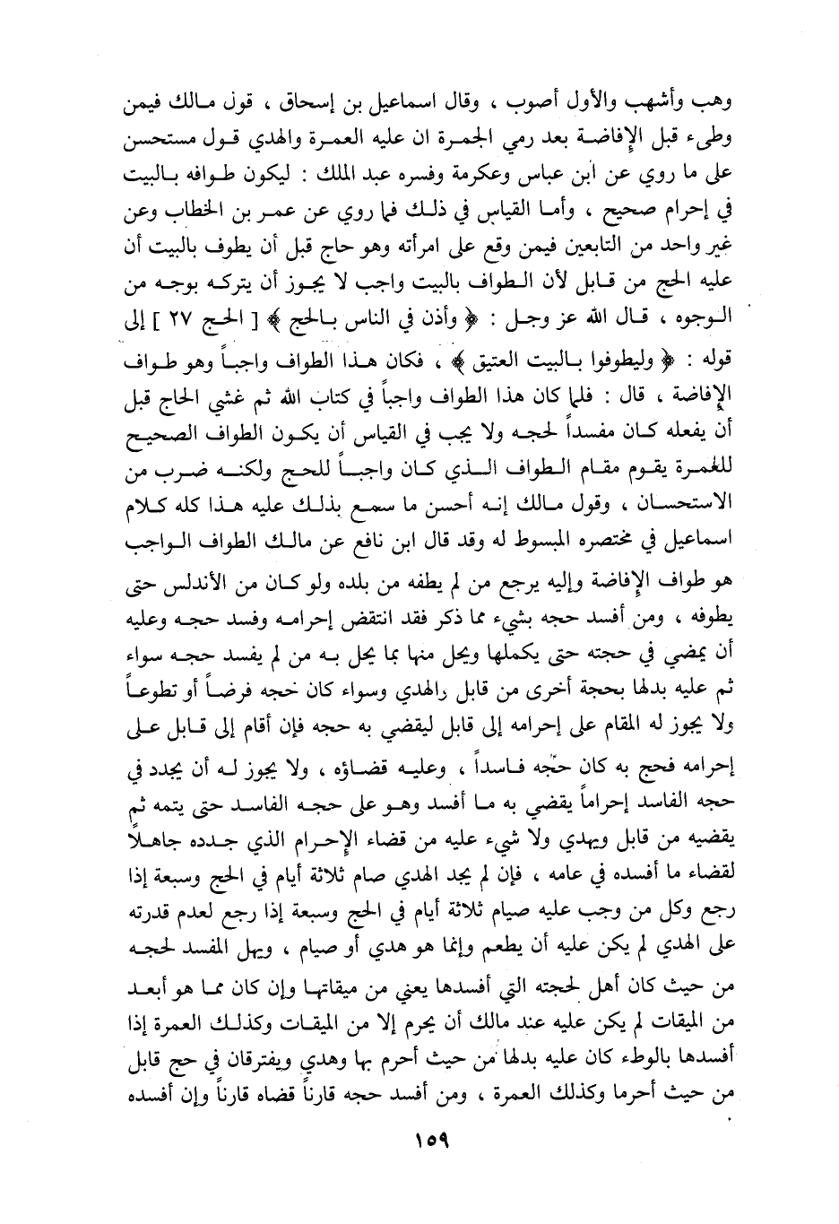 وهب وأشهب والأول أصوب وقال اسماعيل بن اسحاق قول مالك فيمن وطئ قبل الإفاضة بعد رمي الجمرة ان عليه العمرة والهدي قول مستحسن على ما روي عن ابن عباس وعكرمة وفسره عبد الملك ليكون طوافه بالبيت في إحرام صحيح وأما القياس في ذلك فما روي عن عمر بن الخطاب وعن غير واحد من التابعين فيمن وقع على امرأته وهو حاج قبل أن يطوف بالبيت أن عليه الحج من قابل لأن الطواف بالبيت واجب لا يجوز أن يتركه بوجه من الوجوه قال الله عز وجل وأذن في الناس بالحج الحج إلى قوله وليطوفوا بالبيت العتيق فكان هذا الطواف واجبا وهو طواف الإفاظة قال فلما كان هذا الطواف واجبا في كتاب الله ثم غشي الحاج قبل أن يفعله كان مفسدا لحجه ولا يجب في القياس أن يكون الطواف الصحيح للعمرة يقوم مقام الطواف الذي كان واجبا للحج ولكنه ضرب من الاستحسان وقول مالك إنه أحسن ما سمع بذلك عليه هذا كله كلام اسماعيل في مختصره المبسوط له وقد قال ابن نافع عن مالك الطواف الواجب هو طواف الإفاضة وإليه يرجع من لم يطفه من بلده ولو كان من الأندلس حتى يطوفه ومن أفسد حجه بشيء مما ذكر فقد انتقض إحرامه وفسد حجه وعليه أن يمضي في حجته حتى يكملها ويحل منها بما يحل به من لم يفسد حجه سواء ثم عليه بدلها بحجة أخرى من قابل والهدي وسواء كان حجه فرضا أو تطوعا ولا يجوز له المقام على إحرامه إلى قابل ليقضي به حجه فإن أقام الى قابل على إحرامه فحج به كان حجه فاسدا وعليه قضاؤه ولا يجوز له أن يجدد في حجه الفاسد احراما ويقضي به ما أفسد وهو على الحج الفاسد حتى يتمه ثم يقضيه من قابل ويهدي ولا شئ عليه من قضاء الإحرام الذي جدده جاهلا لقضاء ما أفسده في عامه فإن لم يجد الهدي صام ثلاثة أيام في الحج وسبعة إذا رجع وكل من وجب عليه صيام ثلاثة أيام في الحج وسبعة إذا رجع لعدم قدرته عل الهدي لم يكن عليه أن يطعم وإنما هو هدي أو صيام ويهل المفسد لحجه من حيث كان أهل لحجته التي أفسدها يعني من ميقاتها وإن كان مما هو أبعد من الميقات لم يكن عليه عند مالك أن يحرم إلا من الميقات وكذلك العمرة إذا أفسدها بالوطء كان عليه بدلها من حيث أحرم بها وهدي ويفترقان في حج قابل من حيث أحرما وكذلك العمرة ومن أفسد حجه قارنا قضاه قارنا وإن أفسده