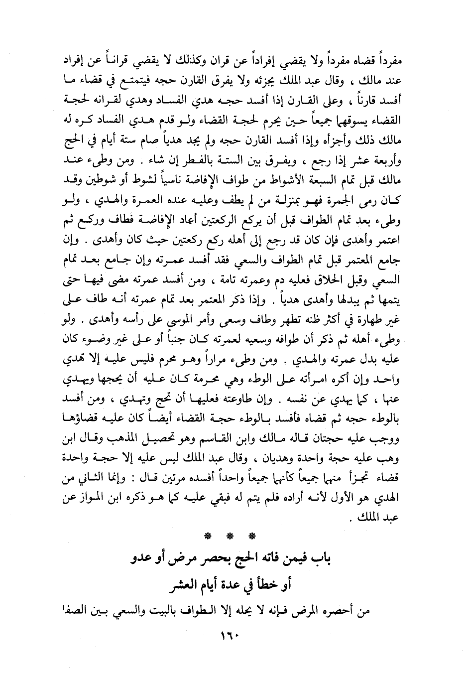 مفردا قضاه مفردا ولا يقضي إفرادا عن قران وكذلك لا يقضي قرانا عن إفراد عند مالك وقال عبد الملك يجزئه ولا يفرق القارن حجه فيتمتع في قضاء ما أفسد قارنا وعلى القارن إذا أفسد حجه هدي الفساد وهدي لقرانه لحجة القضاء يسوقهما جميعا حين يحرم لحجة القضاء ولو قدم هدي الفساد كره له مالك ذلك وأجزأه وإذا أفسد القارن حجه ولم يجد هديا صام ستة أيام في الحج وأربعة عشر إذا رجع ويفرق بين الستة بالفطر إن شاء ومن وطئ عند مالك قبل تمام السبعة الأشواط من طواف الإفاضة ناسيا لشوط أو شوطين وقد كان رمى الجمرة فهو بمنزلة من لم يطف وعليه عنده العمرة والهدي ولو وطئ بعد تمام الطواف قبل أن يركع الركعتين أعاد الإفاضة فطاف وركع ثم اعتمر وأهدى فإن كان قد رجع إلى أهله ركع ركعتين حيث كان وأهدى وإن جامع المعتمر قبل تمام الطواف والسعي فقد أفسد عمرته وإن جامع بعد تمام السعي وقبل الحلاق فعليه دم وعمرته تامة ومن أفسد عمرته مضى فيها حتى يتمها ثم يبدلها وأهدى هديا وإذا ذكر المعتمر بعد تمام عمرته أنه طاف على غير طهارة في أكثر ظنه تطهر وطاف وسعى وأمر الموسى على رأسه وأهدى ولو وطئ أهله ثم ذكر أن طوافه وسعيه لعمرته كان جنبا أو على غير وضوء كان عليه بدل عمرته والهدي ومن وطئ مرارا وهو محرم فليس عليه إلا هدي واحد وإن اكره امرأته على الوطء وهي محرمة كان عليه أن يحجها ويهدي عنها كما يهدي عن نفسه وإن طاوعته فعليها أن تحج وتهدي ومن أفسد بالوطء حجه ثم قضاه فأفسد بالوطء حجة القضاء أيضا كان عليه قضاؤها ووجب عليه حجتان قاله مالك وابن القاسم وهو تحصيل المذهب وقال ابن وهب عليه حجة واحدة وهديان وقال عبد الملك ليس عليه إلا حجة واحدة قضاء تجزأ منهما جميعا كأنهما جميعا واحدا أفسده مرتين قال وإنما الثاني من الهدي هو الأول لأنه أراده فلم يتم له فبقي عليه كما هو ذكره ابن المواز عن عبد الملك باب فيمن فاته الحج بحصر مرض أو عدو أو خطأ في عدة أيام العشر من أحصره المرض فإنه لا يحله إلا الطواف بالبيت والسعي بين الصفا