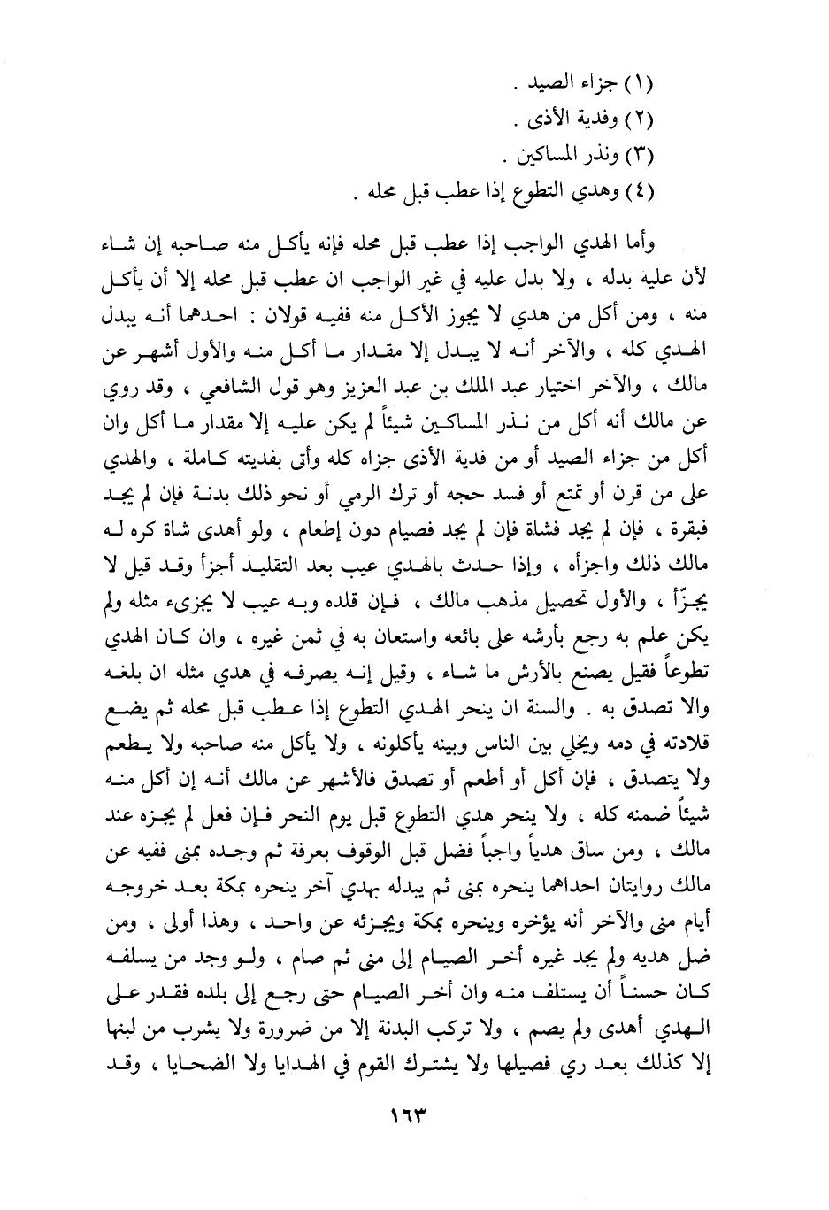 جزاء الصيد وفدية الأذى ونذر المساكين وهدي التطوع إذا عطب قبل محله وأما الهدي الواجب إذا عطب قبل محله فإنه يأكل منه صاحبه إن شاء لأن عليه بدله ولا بدل عليه في غير الواجب ان عطب قبل محله إلا أن يأكل منه ومن أكل من هدي لا يجوز الأكل منه ففيه قولان احدهما أنه يبدل الهدي كله والآخر أنه لا يبدل الا مقدار ما أكله منه والأول أشهر عن مالك والآخر اختيار عبد الملك بن عبد العزيز وهو قول الشافعي وقد روي عن مالك أنه أكل من نذر المساكين شيئا لم يكن عليه إلا مقدار ما أكل وان أكل من جزاء الصيد أو من فدية الأذى جزاه كله وأتى بفديته كاملة والهدي على من قرن أو تمتع أو فسد حجه أو ترك الرمي أو نحو ذلك بدنة فإن لم يجد فبقرة فإن لم يجد فشاة فإن لم يجد فصيام دون إطعام ولو أهدى شاة كره له مالك ذلك واجزأه وإذا حدث بالهدي عيب بعد التقليد أجزأ وقد قيل لا يجزأ والأول تحصيل مذهب مالك فإن قلده وبه عيب لا يجزئ مثله ولم يكن علم به رجع بأرشه على بائعه واستعان به في ثمن غيره وان كان الهدي تطوعا فقيل يصنع بالأرش ما شاء وقيل إنه يصرفه في هدي مثله ان بلغه والا تصدق به والسنة ان ينحر الهدي التطوع إذا عطب قبل محله ثم يضع قلادته في دمه ويخلي بين الناس وبينه يأكلونه ولا يأكل منه صاحبه ولا يطعم ولا يتصدق فإن أكل أو أطعم أو تصدق فالأشهر عن مالك أنه إن أكل منه شيئا ضمنه كله ولا ينحر هدي التطوع قبل يوم النحر فإن فعل لم يجزه عند مالك ومن ساق هديا واجبا فضل قبل الوقوف بعرفة ثم وجده بمنى ففيه عن مالك روايتان احداهما ينحره بمنى ثم يبدله بهدي آخر ينحره بمكة بعد خروجه أيام منى والآخر أنه يؤخره وينحره بمكة ويجزئه عن واحد وهذا أولى ومن ضل هديه ولم يجد غيره أخر الصيام إلى منى ثم صام ولو وجد من يسلفه كان حسنا أن يستلف منه وأن أخر الصيام حتى رجع إلى بلده فقدر على الهدي أهدى ولم يصم ولا تركب البدنة إلا من ضرورة وولا يشرب من لبنها إلا كذلك بعد ري فصيلها ولا يشترك القوم في الهدايا ولا الضحايا وقد