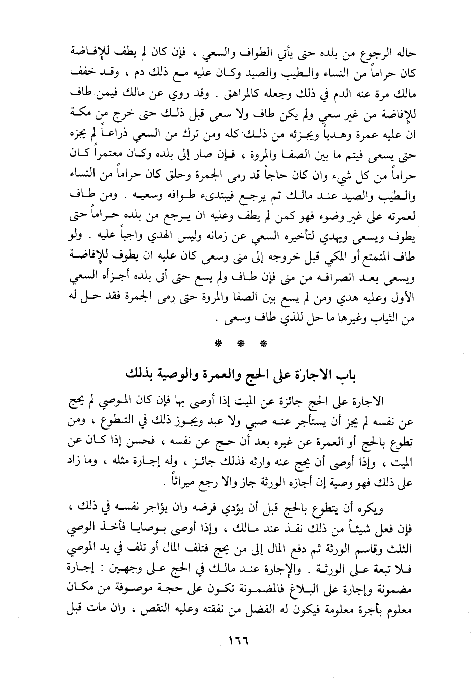حاله الرجوع من بلده حتى يأتي الطواف والسعى فإن كان لم يطف للإفاضة كان حراما من النساء والطيب والصيد وكان عليه مع ذلك دم وقد خفف مالك مرة عنه الدم في ذلك وجعله كالمراهق وقد روي عن مالك فيمن طاف للإفاضة من غير سعي من غير سعي ولم يكن طاف معي ولا سعى قبل ذلك حتى خرج من مكة ان عليه عمرة وهديا ويجزئه من ذلك كله ومن ترك من السعي ذراعا لم يجزه حتى يسعى فيتم ما بين الصفا والمروة فإن صار إلى بلده وكان معتمرا كان حراما من كل شئ وان كان حاجا قد رمى الجمرة وحلق كان حراما من النساء والطيب والصيد عند مالك ثم يرجع فيبتدئ طوافه وسعيه ومن طاف لعمرته على غير وضوء فهو كمن لم يطف وعليه ان يرجع من بلده حراما حتى يطوف ويسعى ويهدي لتأخيره السعي عن زمانه وليس الهدي واجبا عليه ولو طاف المتمتع أو المكي قبل خروجه إلى منى وسعى كان عليه ان يطوف للإفاضة ويسعى بعد انصرافه من منى فإن طاف ولم يسع حتى أتى بلده أجزأه السعي الأول وعليه هدي ومن لم يسع بين الصفا والمروة حتى رمى الجمرة فقد حل له من الثياب وغيرها ما حل للذي طاف وسعى باب الاجازة على الحج والعمرة والوصية بذلك الاجارة على الحج جائزة عن الميت إذا أوصى بها فإن كان الموصي لم يحج عن نفسه لم يجز أن يستأجر عنه صبي ولا عبد ويجوز ذلك في التطوع ومن تطوع بالحج أو العمرة عن غيره بعد أن حج عن نفسه فحسن إذا كان عن الميت وإذا أوصى أن يحج عنه وارثه فذلك جائز وله إجارة مثله وما زاد على ذلك فهو وصية إن أجازه الورثة جاز والا رجع ميراثا ويكره أن يتطوع بالحج قبل أن يؤدي فرضه وان يؤاجر نفسه في ذلك فإن فعل شيئا من ذلك نفذ عند مالك وإذا أوصى بوصايا فأخذ الوصي الثلث وقاسم الورثة ثم دفع المال إلى من يحج فتلف المال أو تلف في يد الموصي فلا تبعة على الورثة والإجارة عند مالك في الحج على وجهين إجارة مضمونه وإجارة على البلاغ فالمضمونة تكون على حجة موصوفة من مكان معلوم بأجرة معلومة فيكون له الفضل من نفقته وعليه النقص وان مات قبل